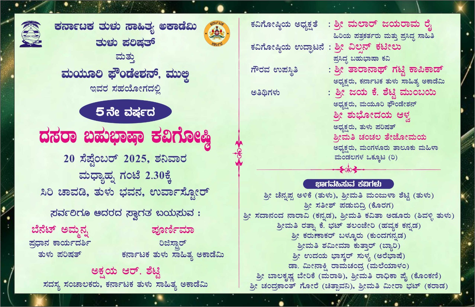 ಹಿರಿಯ ಪತ್ರ ಕರ್ತ, ಸಾಹಿತಿ ಮಲಾರ್ ಜಯರಾಮ್ ರೈ ಇವರ ಅಧ್ಯಕ್ಷತೆಯಲ್ಲಿ ನಡೆಯಲಿರುವ ಈ ಕವಿ ಗೋಷ್ಠಿಯನ್ನು ಬಹು ಭಾಷಾ ಕವಿ ವಿಲ್ಸನ್ ಕಟೀಲು ಉದ್ಘಾಟಿಸಲಿದ್ದು, ಕಾರ್ಯಕ್ರಮದಲ್ಲಿ ಕಾಸರಗೋಡು, ದಕ್ಷಿಣ ಕನ್ನಡ, ಉಡುಪಿ ಜಿಲ್ಲಾ ವ್ಯಾಪ್ತಿಯ 13 ಭಾಷೆಗಳ ಕವಿಗಳು ಕವಿತೆ ವಾಚಿಸಲಿದ್ದಾರೆ. ಮಯೂರಿ ಫೌಂಡೇಶನ್ ಅಧ್ಯಕ್ಷ ಜಯ ಕೆ. ಶೆಟ್ಟಿ ಮುಂಬಯಿ, ತುಳು ಪರಿಷತ್ ಅಧ್ಯಕ್ಷ ಶುಭೋದಯ ಆಳ್ವ, ಮಂಗಳೂರು ತಾಲೂಕು ಮಹಿಳಾ ಮಂಡಲಗಳ ಒಕ್ಕೂಟದ ಅಧ್ಯಕ್ಷ ಚಂಚಲ ತೇಜೋಮಯ ಮುಖ್ಯ ಅತಿಥಿಯಾಗಿ ಭಾಗವಹಿಸಲಿದ್ದಾರೆ.