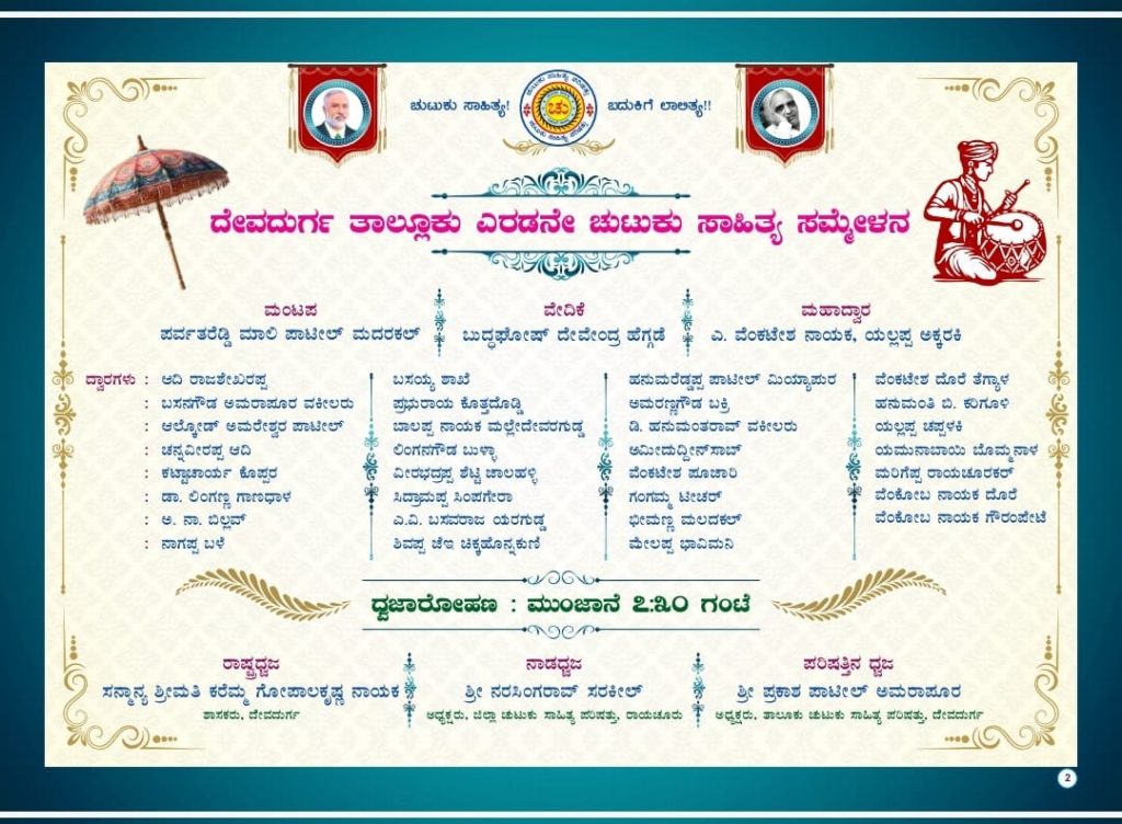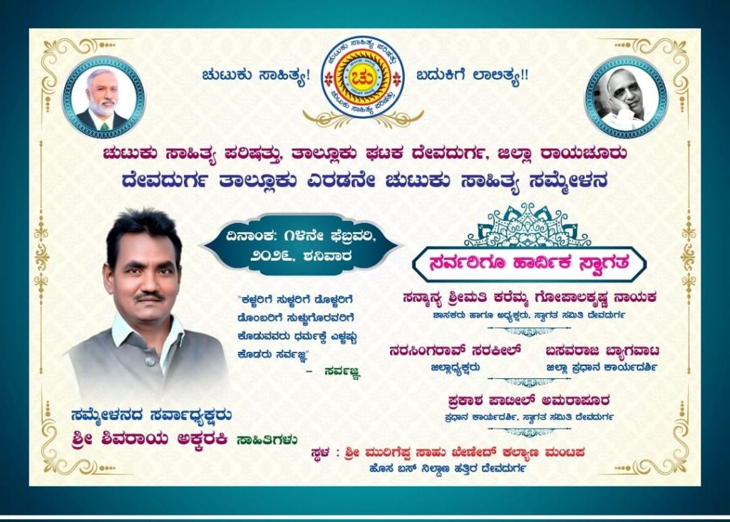 ದೇವದುರ್ಗ : ಚುಟುಕು ಸಾಹಿತ್ಯ ಪರಿಷತ್ತು ದೇವದುರ್ಗ ತಾಲೂಕು ಘಟಕ ರಾಯಚೂರು ಜಿಲ್ಲಾ ಇದರ ವತಿಯಿಂದ ದೇವದುರ್ಗ ತಾಲೂಕು ಎರಡನೇ ಚುಟುಕು ಸಾಹಿತ್ಯ ಸಮ್ಮೇಳನವನ್ನು ದಿನಾಂಕ 14 ಫೆಬ್ರವರಿ 2026ರಂದು ದೇವದುರ್ಗ ಹೊಸ ಬಸ್ ನಿಲ್ದಾಣ ಹತ್ತಿರ ಇರುವ ಶ್ರೀ ಮುರಿಗೆಪ್ಪ ಸಾಹು ಖೇಣೇದ್ ಕಲ್ಯಾಣ ಮಂಟಪದಲ್ಲಿ ಹಮ್ಮಿಕೊಳ್ಳಲಾಗಿದೆ.