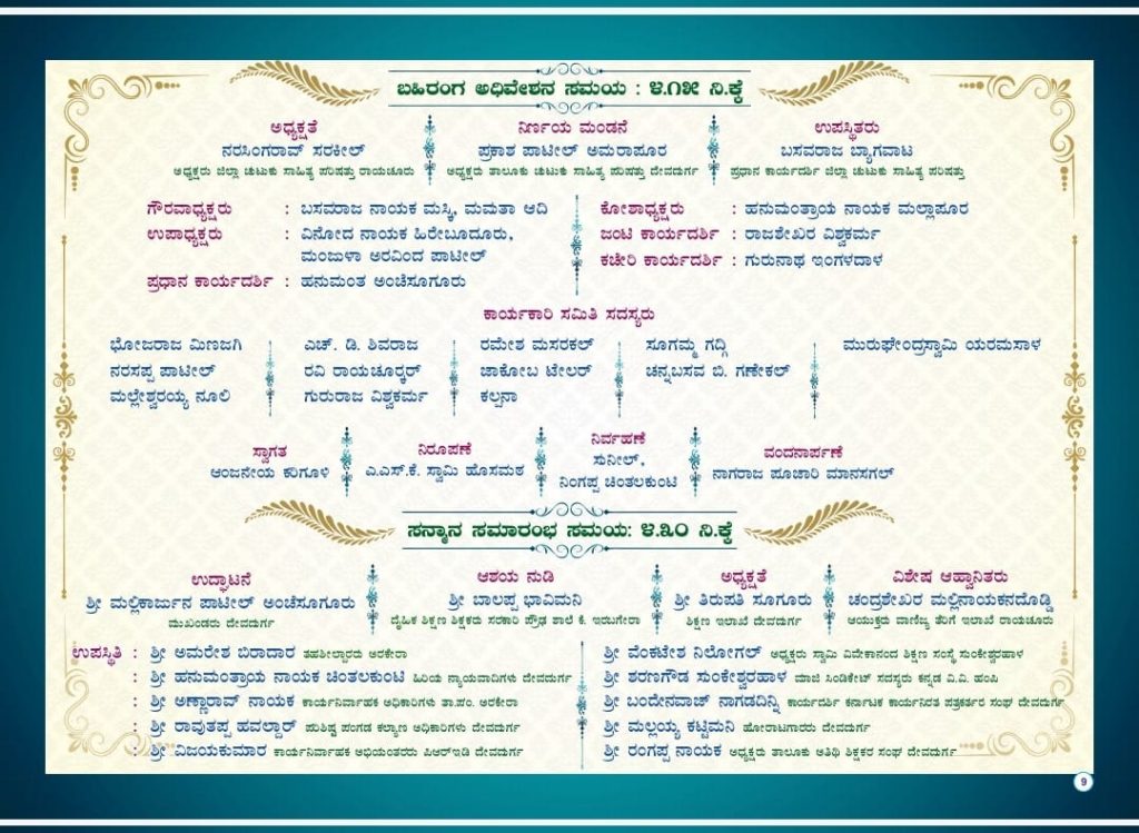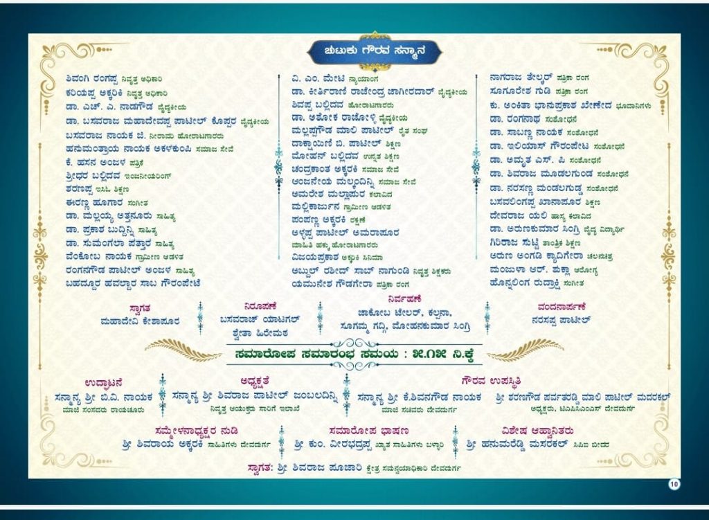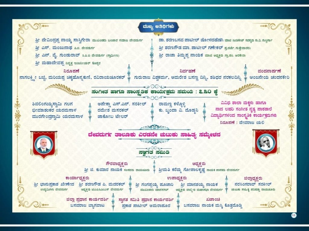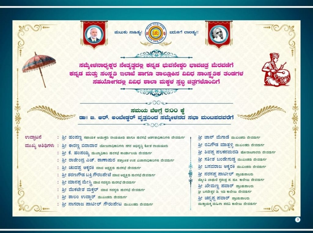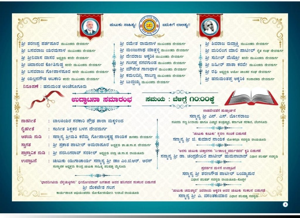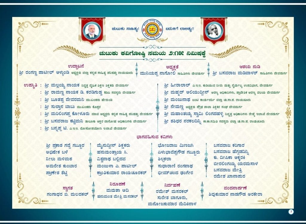 ಮುಂಜಾನೆ 7-30 ಗಂಟೆಗೆ ಧ್ವಜಾರೋಹಣ, 8-00 ಗಂಟೆಗೆ ಕನ್ನಡ ಭುವನೇಶ್ವರಿ ಭಾವಚಿತ್ರದ ಮೆರವಣಿಗೆ ಮತ್ತು 10-00 ಗಂಟೆಗೆ ಚುಟುಕು ಯುಗಾಚಾರ್ಯ ಸನ್ಮಾನ್ಯ ಡಾ. ಎಂ.ಜಿ.ಆರ್. ಅರಸ್ ಇವರು ಚುಟುಕು ಸಾಹಿತ್ಯ ಸಮ್ಮೇಳನದ ಉದ್ಘಾಟನೆ ಮಾಡಲಿದ್ದಾರೆ. ಇದೇ ಸಂದರ್ಭದಲ್ಲಿ ‘ಭಾವದೀಟಿಯ ಬೆಳ್ಳಿಚುಕ್ಕಿಗಳು’ ಭೀಮೋಜಿರಾವ್ ಜಗತಾಪ ಇವರ ಹನಿಗವನ ಸಂಕಲನ, ‘ಚುಟುಕು ಕುಟುಕು’ ಸ್ಮರಣ ಸಂಚಿಕೆ, ‘ಅರಸು ಚುಟುಕು ಚಿತ್ತಾರಗಳು’ ಸೀತಾಲಕ್ಷ್ಮಿ ವರ್ಮರವರ ಕೃತಿ ಮತ್ತು ‘ಚುಟುಕು ಚಮತ್ಕಾರ’ ಶಿವರಾಯ ಅಕ್ಕರಕಿ ಇವರ ಚುಟುಕು ಸಂಕಲನ ಬಿಡುಗಡೆಗೊಳ್ಳಲಿದೆ. ಮಧ್ಯಾಹ್ನ 1-00 ಗಂಟೆಗೆ ಚುಟುಕು ಸಾಹಿತ್ಯ ಸಂಕೀರ್ಣ ಗೋಷ್ಠಿ -01ನ್ನು ಶ್ರೀದೇವಿ ರಾಜಶೇಖರ ನಾಯಕ ಇವರು ಉದ್ಘಾಟನೆ ಮಾಡಲಿದ್ದು, ಶ್ರೀಮತಿ ಇಂದಿರಾ ಆರ್. ಇವರು ಉದ್ಘಾಟನೆ ಮಾಡಲಿದ್ದಾರೆ. ಸಾಹಿತಿ ಭೀಮೋಜಿರಾವ್ ಜಗತಾಪ ಇವರು ‘ಸಮಕಾಲೀನ ಸಾಹಿತ್ಯ ಸ್ಪರ್ಧೆಯಲ್ಲಿ ಚುಟುಕು ಸಾಹಿತ್ಯಕ್ಕಿರುವ ಹಿರಿಮೆ ಗರಿಮೆ’, ಸಹ ಪ್ರಾಧ್ಯಾಪಕರಾದ ಡಾ. ಸುಭಾಶ್ಚಂದ್ರ ಪಾಟೀಲ್ ಇವರು ‘ಸಾಮಾಜಿಕ ಸ್ವಾಸ್ತ್ಯ, ಕಾಪಾಡುವಲ್ಲಿ ಚುಟುಕು ಸಾಹಿತ್ಯ’ ಮತ್ತು ವಕೀಲ ಬಸನಗೌಡ ದೇಸಾಯಿ ಕಕ್ಕಲದೊಡ್ಡಿ ಇವರು ‘ನೀರಾವರಿ ಲಭ್ಯತೆ ಮತ್ತು ಸಮಸ್ಯೆಗಳು’ ಎಂಬ ವಿಷಯದ ಬಗ್ಗೆ ವಿಷಯ ಮಂಡನೆ ಮಾಡಲಿದ್ದಾರೆ. 2-15 ಗಂಟೆಗೆ ಸಾಹಿತಿ ಮುನಿಯಪ್ಪ ನಾಗೋಲಿ ಇವರ ಅಧ್ಯಕ್ಷತೆಯಲ್ಲಿ ‘ಚುಟುಕು ಕವಿಗೋಷ್ಠಿ’ ನಡೆಯಲಿದೆ. 3-30 ಗಂಟೆಗೆ ಸಮ್ಮೇಳನಾಧ್ಯಕ್ಷರೊಂದಿಗೆ ಸಂವಾದ, 4-15ಕ್ಕೆ ಬಹಿರಂಗ ಅಧಿವೇಶನ, 4-30ಕ್ಕೆ ಸನ್ಮಾನ ಸಮಾರಂಭ, ಚುಟುಕು ಗೌರವ ಸನ್ಮಾನ, 5-15 ಗಂಟೆಗೆ ಸಮಾರೋಪ ಸಮಾರಂಭ, 7-30ಕ್ಕೆ ಸಂಗೀತ ಮತ್ತು ಸಾಂಸ್ಕೃತಿಕ ಕಾರ್ಯಕ್ರಮ ನಡೆಯಲಿದೆ.