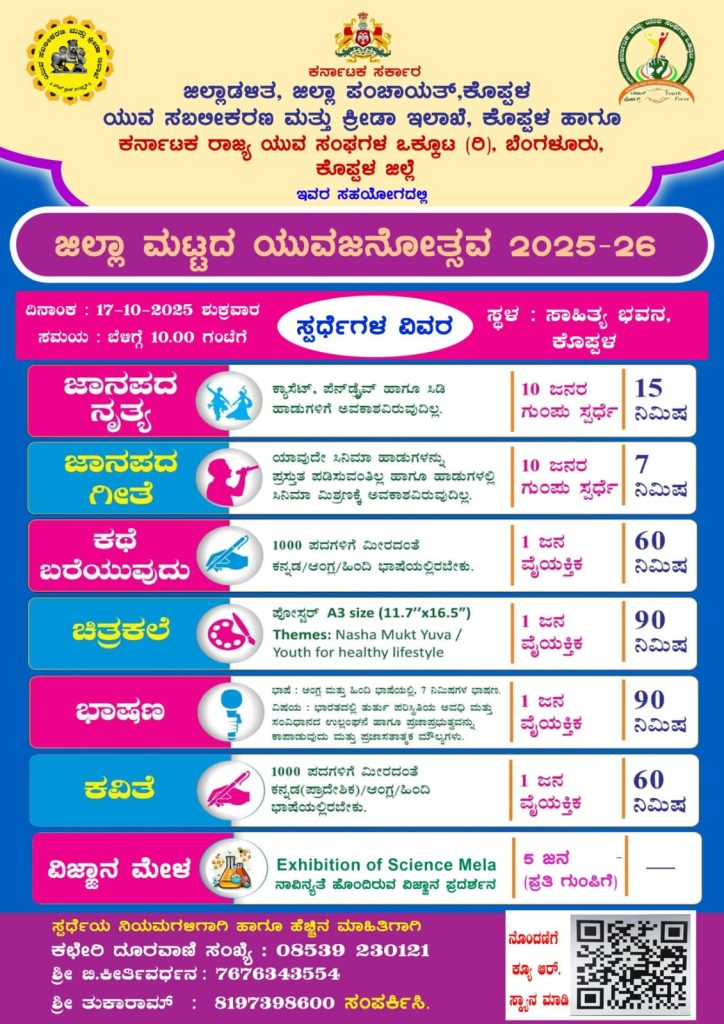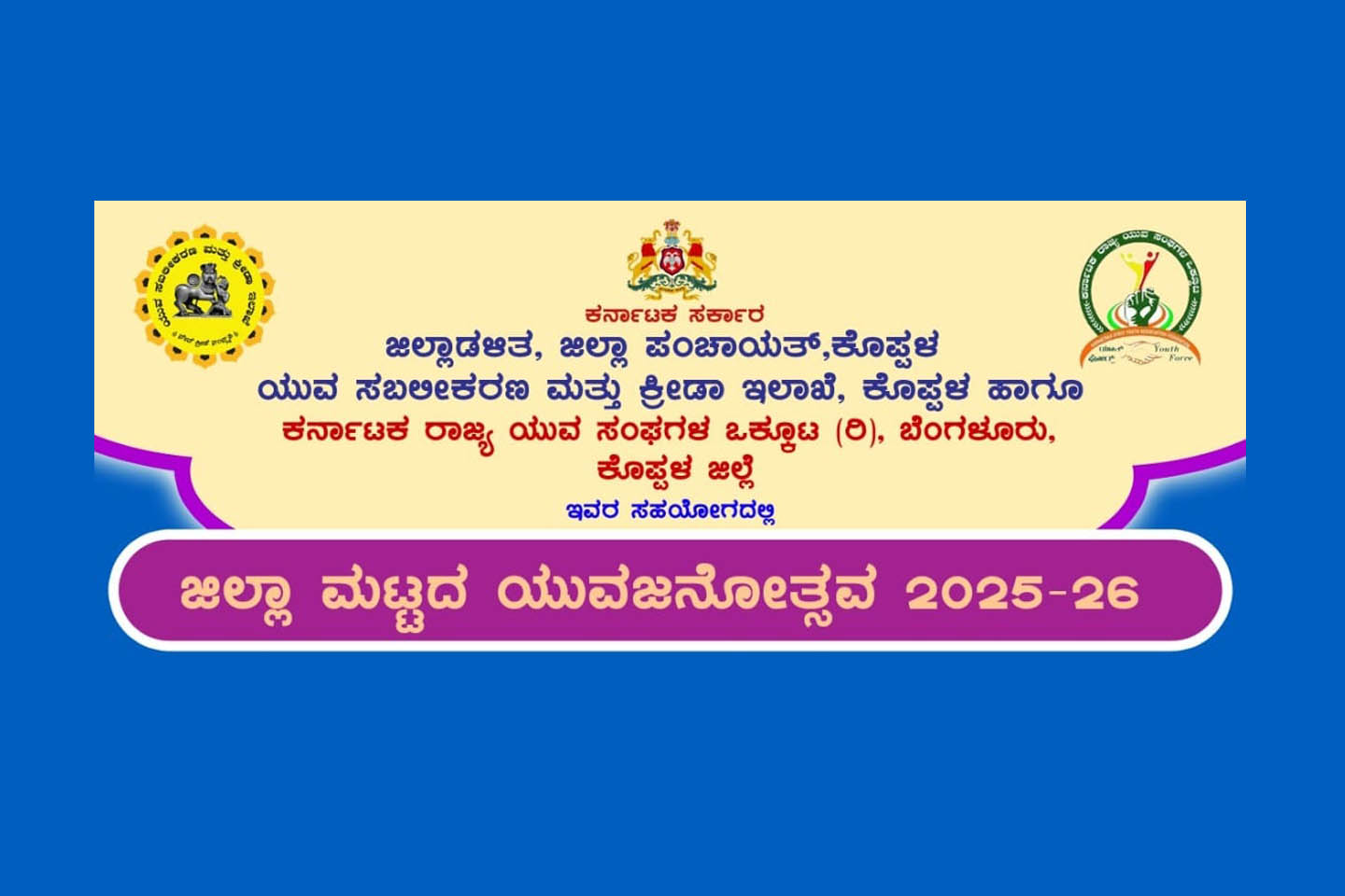 ಕೊಪ್ಪಳ : ಜಿಲ್ಲಾಡಳಿತ ಜಿಲ್ಲಾ ಪಂಚಾಯತ್ ಕೊಪ್ಪಳ, ಯುವ ಸಬಲೀಕರಣ ಮತ್ತು ಕ್ರೀಡಾ ಇಲಾಖೆ ಕೊಪ್ಪಳ ಹಾಗೂ ಕರ್ನಾಟಕ ರಾಜ್ಯ ಯುವ ಸಂಘಗಳ ಒಕ್ಕೂಟ (ರಿ.) ಬೆಂಗಳೂರು ಕೊಪ್ಪಳ ಜಿಲ್ಲೆ ಇವರ ಸಹಯೋಗದಲ್ಲಿ ‘ಜಿಲ್ಲಾ ಮಟ್ಟದ ಯುವಜನೋತ್ಸವ 2025-26’ ದಿನಾಂಕ 17 ಅಕ್ಟೋಬರ್ 2025ರಂದು ಬೆಳಿಗ್ಗೆ 10-00 ಗಂಟೆಗೆ ಕೊಪ್ಪಳ ಸಾಹಿತ್ಯ ಭವನದಲ್ಲಿ ನಡೆಯಲಿದೆ.
