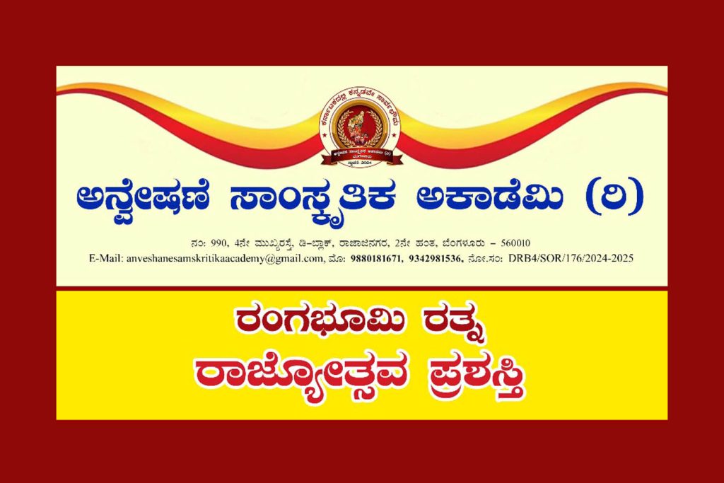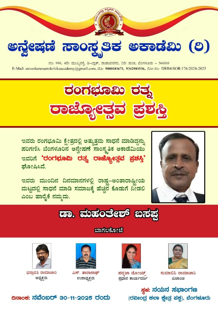ಬೆಂಗಳೂರು : ಅನ್ವೇಷಣೆ ಸಾಂಸ್ಕೃತಿಕ ಅಕಾಡೆಮಿ (ರಿ) ಇದರ ವತಿಯಿಂದ ನೀಡುವ ‘ರಂಗಭೂಮಿ ರತ್ನ ರಾಜ್ಯೋತ್ಸವ ಪ್ರಶಸ್ತಿ’ಗೆ ಬಾಗಲಕೋಟೆಯ ಡಾ. ಮಹಂತೇಶ್ ಬಸಪ್ಪ ಇವರು ಆಯ್ಕೆಯಾಗಿದ್ದಾರೆ. ಇವರು ರಂಗಭೂಮಿ ಕ್ಷೇತ್ರದಲ್ಲಿ ಅತ್ಯುತ್ತಮ ಸಾಧನೆ ಮಾಡಿದ್ದನ್ನು ಪರಿಗಣಿಸಿ ಈ ಪ್ರಶಸ್ತಿಯನ್ನು ಘೋಷಿಸಿದೆ. ದಿನಾಂಕ 30 ನವೆಂಬರ್ 2025ರಂದು ಬೆಂಗಳೂರಿನ ನಯನ ಸಭಾಂಗಣದಲ್ಲಿ ಪ್ರಶಸ್ತಿ ಪ್ರದಾನ ನಡೆಯಲಿದೆ.