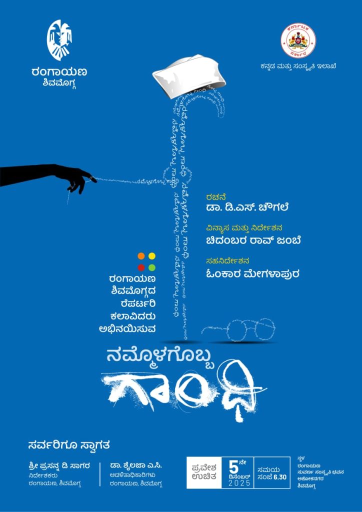 ಶಿವಮೊಗ್ಗ : ಕನ್ನಡ ಮತ್ತು ಸಂಸ್ಕೃತಿ ಇಲಾಖೆ ಮತ್ತು ರಂಗಾಯಣ ಶಿವಮೊಗ್ಗ ಇವರ ಜಂಟಿ ಆಶ್ರಯದಲ್ಲಿ ರಂಗಾಯಣ ಶಿವಮೊಗ್ಗದ ರೆಪರ್ಟರಿ ಕಲಾವಿದರು ಅಭಿನಯಿಸುವ ‘ನಮ್ಮೊಳಗೊಬ್ಬ ಗಾಂಧಿ’ ನಾಟಕ ಪ್ರದರ್ಶನವನ್ನು ದಿನಾಂಕ 05 ಡಿಸೆಂಬರ್ 2025ರಂದು ಸಂಜೆ 6-30 ಗಂಟೆಗೆ ಶಿವಮೊಗ್ಗದ ರಂಗಾಯಣ ಸುವರ್ಣ ಸಂಸ್ಕೃತಿ ಭವನದಲ್ಲಿ ಹಮ್ಮಿಕೊಳ್ಳಲಾಗಿದೆ. ಡಾ. ಡಿ.ಎಸ್. ಚೌಗಲೆ ಇವರು ರಚಿಸಿರುವ ಈ ನಾಟಕವನ್ನು ಚಿದಂಬರ ರಾವ್ ಜಂಬೆ ಇವರು ವಿನ್ಯಾಸ ಮತ್ತು ನಿರ್ದೇಶನ ಮಾಡಿರುತ್ತಾರೆ.