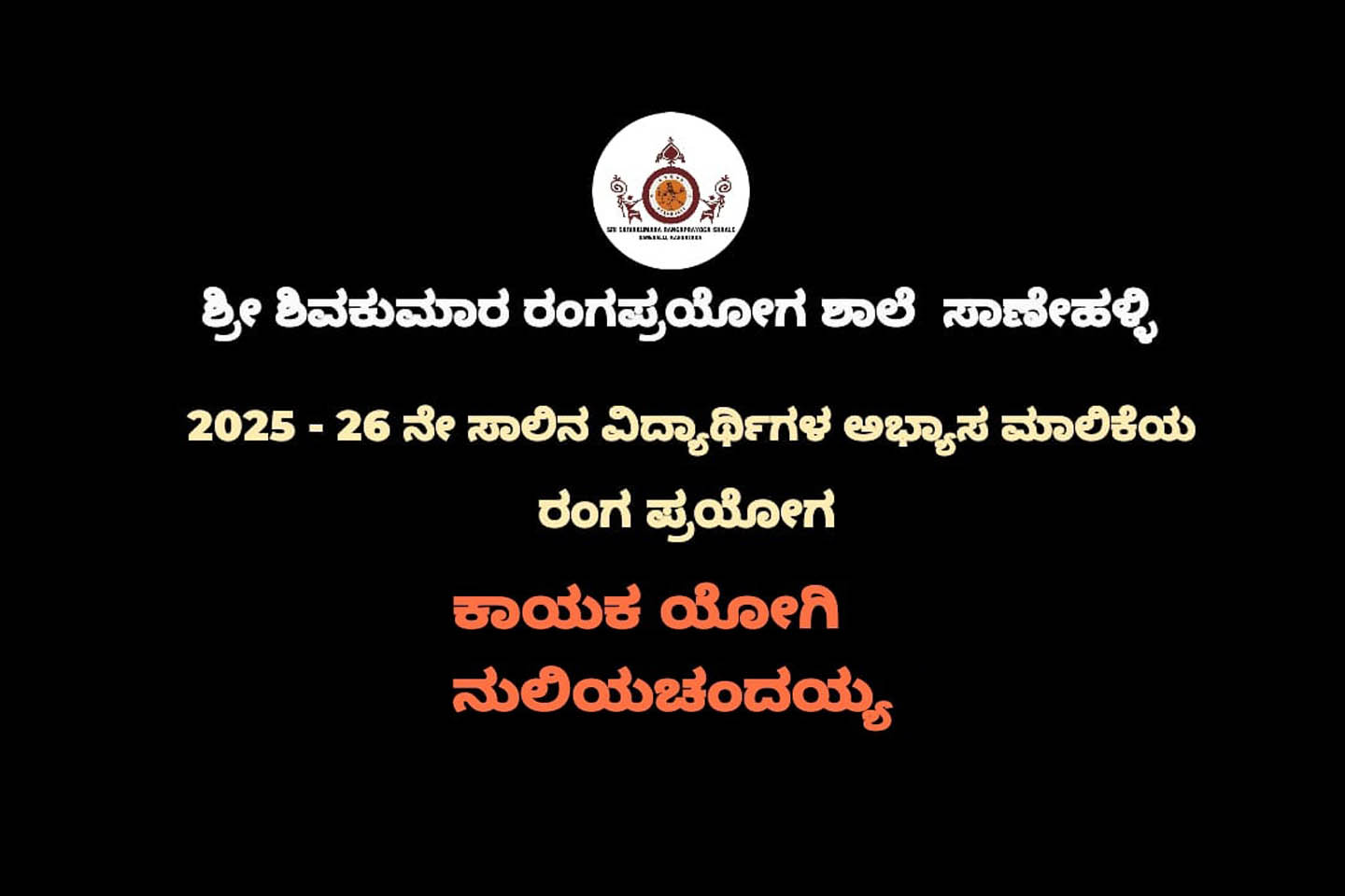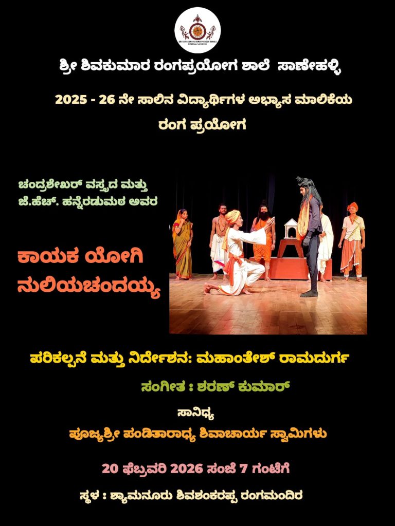 ಸಾಣೇಹಳ್ಳಿ : ಶ್ರೀ ಶಿವಕುಮಾರ ರಂಗಪ್ರಯೋಗ ಶಾಲೆಯ 2025-26ನೆಯ ಸಾಲಿನ ವಿದ್ಯಾರ್ಥಿಗಳ ಅಭ್ಯಾಸ ಮಾಲಿಕೆಯ ರಂಗ ಪ್ರಯೋಗವನ್ನು ದಿನಾಂಕ 20 ಫೆಬ್ರವರಿ 2026ರಂದು ಸಂಜೆ 7-00 ಗಂಟೆಗೆ ಸಾಣೇಹಳ್ಳಿಯ ಶ್ಯಾಮನೂರು ಶಿವಶಂಕರಪ್ಪ ರಂಗಮಂದಿರದಲ್ಲಿ ಆಯೋಜಿಸಲಾಗಿದೆ.