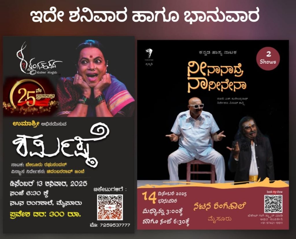 ದಿನಾಂಕ 14 ಡಿಸೆಂಬರ್ 2025ರಂದು ಮಧ್ಯಾಹ್ನ 3-00 ಮತ್ತು ಸಂಜೆ 6-30 ಗಂಟೆಗೆ ವಿನಯ್ ಶಾಸ್ತ್ರಿ ನಿರ್ದೇಶನದಲ್ಲಿ ‘ನೀ ನಾನಾದ್ರೆ ನಾ ನೀನೇನಾ’ ಕನ್ನಡ ಹಾಸ್ಯ ನಾಟಕ ಪ್ರದರ್ಶನಗೊಳ್ಳಲಿದೆ.