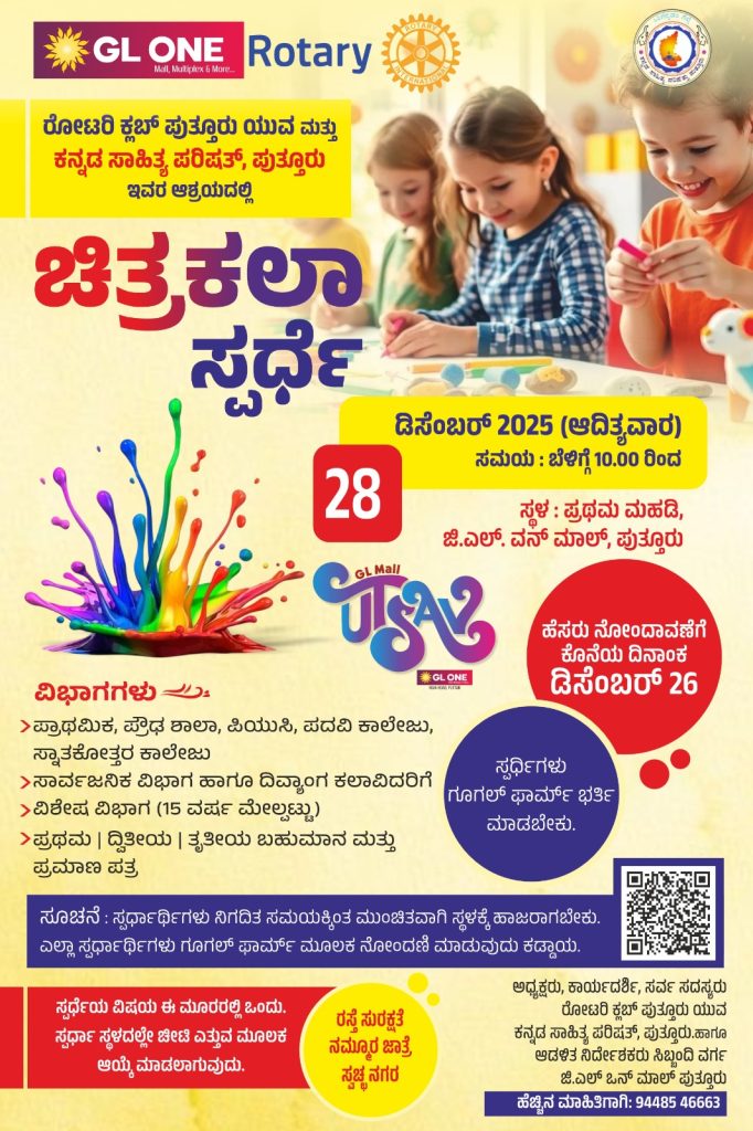 ಪುತ್ತೂರು : ಕನ್ನಡ ಭಾಷೆ, ಸಾಹಿತ್ಯ ಮತ್ತು ಸಂಸ್ಕೃತಿಯ ಉಳಿವು–ಬೆಳವಣಿಗೆಗೆ ನಿರಂತರವಾಗಿ ಶ್ರಮಿಸುತ್ತಿರುವ ಕನ್ನಡ ಸಾಹಿತ್ಯ ಪರಿಷತ್ತು ಪುತ್ತೂರು ತಾಲೂಕು ಘಟಕದ ವತಿಯಿಂದ ಪುತ್ತೂರಿನ ಪ್ರತಿಷ್ಠಿತ ಜಿ.ಎಲ್. ವನ್ ಮಾಲ್ ಮತ್ತು ರೋಟರಿ ಕ್ಲಬ್ ಪುತ್ತೂರು ಯುವ ಇವರ ಸಹಯೋಗದೊಂದಿಗೆ ಚಿತ್ರಕಲಾ ಸ್ಪರ್ಧೆಯನ್ನು ದಿನಾಂಕ 28 ಡಿಸೆಂಬರ್ 2025ರಂದು ಪುತ್ತೂರಿನ ಜಿ.ಎಲ್. ವನ್ ಮಾಲ್ ಪ್ರಥಮ ಮಹಡಿಯಲ್ಲಿ ಆಯೋಜಿಸಲಾಗಿದೆ.