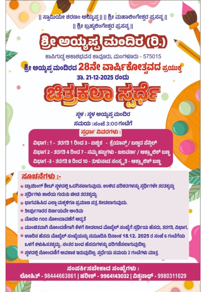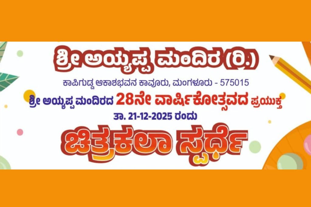 ಮಂಗಳೂರು : ಶ್ರೀ ಅಯ್ಯಪ್ಪ ಮಂದಿರ (ರಿ.) ಕಾಪಿಗುಡ್ಡ ಆಕಾಶಭವನ ಕಾವೂರು ಮಂಗಳೂರು ಇದರ 28ನೇ ವಾರ್ಷಿಕೋತ್ಸವದ ಪ್ರಯುಕ್ತ ಚಿತ್ರಕಲಾ ಸ್ಪರ್ಧೆಯನ್ನು ದಿನಾಂಕ 21 ಡಿಸೆಂಬರ್ 2025ರಂದು ಸಂಜೆ 3-00 ಗಂಟೆಗೆ ಅಯ್ಯಪ್ಪ ಮಂದಿರದಲ್ಲಿ ಆಯೋಜಿಸಲಾಗಿದೆ.