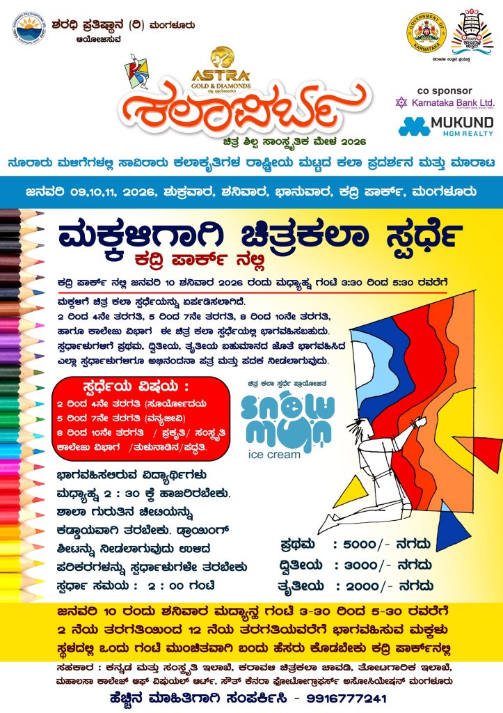 ಮಂಗಳೂರು : ಶರಧಿ ಪ್ರತಿಷ್ಠಾನ (ರಿ.) ಮಂಗಳೂರು ಆಯೋಜಿಸುವ ‘ಕಲಾಪರ್ಬ’ ಚಿತ್ರ ಶಿಲ್ಪ ಸಾಂಸ್ಕೃತಿಕ ಮೇಳದಲ್ಲಿ ‘ಮಕ್ಕಳಿಗಾಗಿ ಚಿತ್ರಕಲಾ ಸ್ಪರ್ಧೆ’ಯನ್ನು ದಿನಾಂಕ 10 ಜನವರಿ 2026ರಂದು ಮಧ್ಯಾಹ್ನ 3-30ರಿಂದ 5-30ರವರೆಗೆ ಮಂಗಳೂರಿನ ಕದ್ರಿ ಪಾರ್ಕಿನಲ್ಲಿ ಹಮ್ಮಿಕೊಳ್ಳಲಾಗಿದೆ.