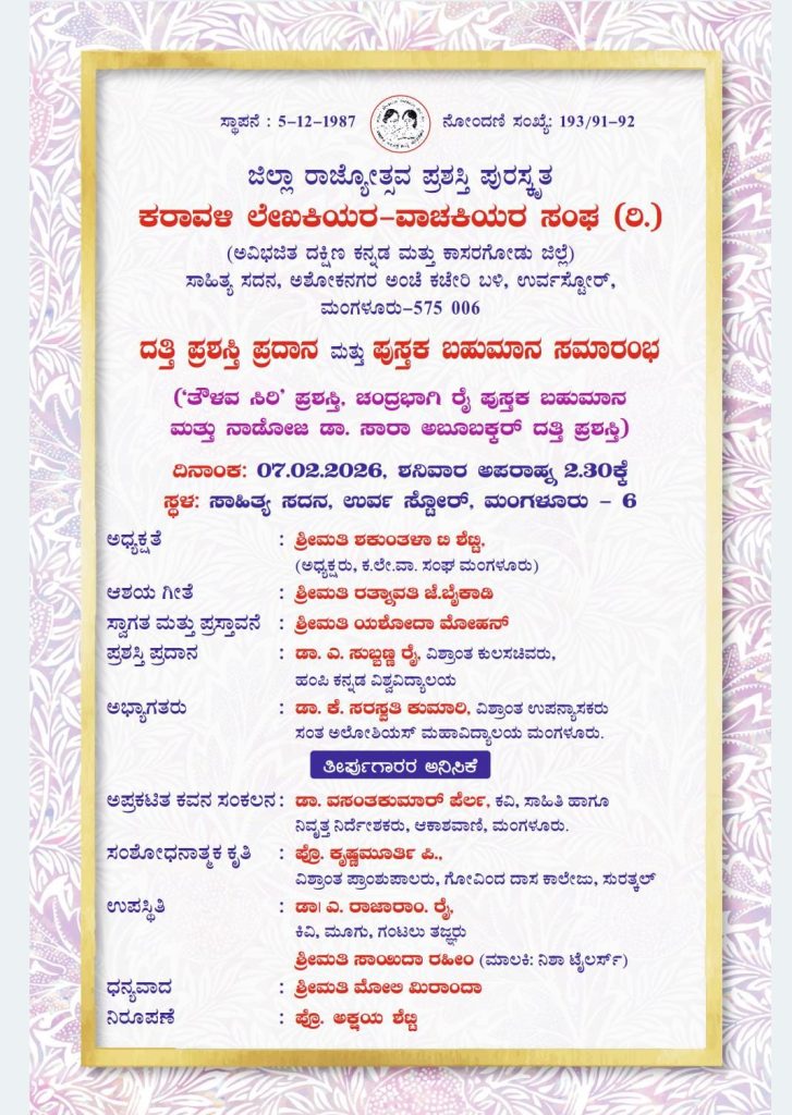 ಮಂಗಳೂರು : ಜಿಲ್ಲಾ ರಾಜ್ಯೋತ್ಸವ ಪ್ರಶಸ್ತಿ ಪುರಸ್ಕೃತ ಅವಿಭಜಿತ ದಕ್ಷಿಣ ಕನ್ನಡ ಮತ್ತು ಕಾಸರಗೋಡು ಜಿಲ್ಲೆಗಳ ‘ಕರಾವಳಿ ಲೇಖಕಿಯರ ವಾಚಕಿಯರ ಸಂಘ (ರಿ.)’ ಇದರ ವತಿಯಿಂದ ದತ್ತಿ ಪ್ರಶಸ್ತಿ ಪ್ರದಾನ ಮತ್ತು ಪುಸ್ತಕ ಬಹುಮಾನ ಸಮಾರಂಭವನ್ನು ದಿನಾಂಕ 07 ಫೆಬ್ರುವರಿ 2026ರಂದು ಅಪರಾಹ್ನ 2-30 ಗಂಟೆಗೆ ಮಂಗಳೂರಿನ ಉರ್ವಸ್ಟೋರ್ ಸಾಹಿತ್ಯ ಸದನದಲ್ಲಿ ಹಮ್ಮಿಕೊಳ್ಳಲಾಗಿದೆ.