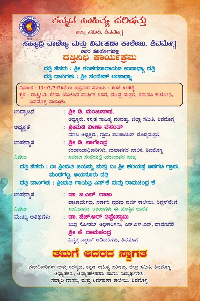 ಶಿವಮೊಗ್ಗ : ಕನ್ನಡ ಸಾಹಿತ್ಯ ಪರಿಷತ್ತು ಜಿಲ್ಲಾ ಸಮಿತಿ ಶಿವಮೊಗ್ಗ ಇದರ ವತಿಯಿಂದ ಮತ್ತು ಶಿವಮೊಗ್ಗದ ಸಹ್ಯಾದ್ರಿ ವಾಣಿಜ್ಯ ಮತ್ತು ನಿರ್ವಹಣಾ ಕಾಲೇಜು ಇವರ ಸಹಯೋಗದಲ್ಲಿ ದತ್ತಿನಿಧಿ ಕಾರ್ಯಕ್ರಮವನ್ನು ದಿನಾಂಕ 13 ಫೆಬ್ರವರಿ 2026ರಂದು ಸಂಜೆ 6-00 ಗಂಟೆಗೆ ಶಿವಮೊಗ್ಗದ ರಾಷ್ಟ್ರೀಯ ಸೇವಾ ಯೋಜನೆ ವಾರ್ಷಿಕ ಶಿಬಿರದಲ್ಲಿ ಹಮ್ಮಿಕೊಳ್ಳಲಾಗಿದೆ.
