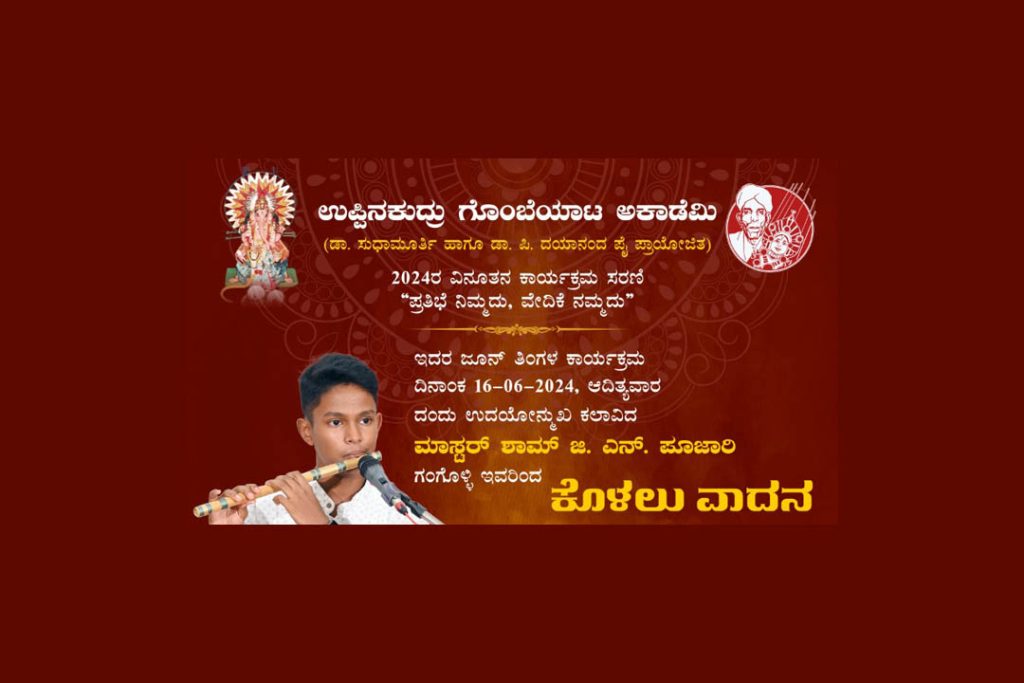 ಉಪ್ಪಿನಕುದ್ರು : ಉಪ್ಪಿನಕುದ್ರು ಗೊಂಬೆಯಾಟ ಅಕಾಡೆಮಿ ವತಿಯಿಂದ 2024ರ ವಿನೂತನ ಕಾರ್ಯಕ್ರಮ ಸರಣಿಯಲ್ಲಿ ಗಂಗೊಳ್ಳಿಯ ಉದಯೋನ್ಮುಖ ಕಲಾವಿದ ಮಾಸ್ಟರ್ ಶಾಮ್ ಜಿ.ಎನ್. ಪೂಜಾರಿ ಇವರಿಂದ ‘ಕೊಳಲು ವಾದನ’ವು ದಿನಾಂಕ 16-06-2024ರಂದು ಸಂಜೆ ಗಂಟೆ 4-00ರಿಂದ ಉಪ್ಪಿನಕುದ್ರು ಗೊಂಬೆ ಮನೆಯಲ್ಲಿ ನಡೆಯಲಿದೆ.