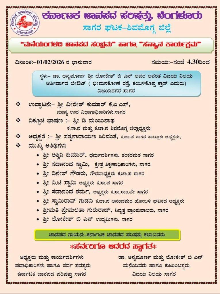 ಸಾಗರ : ಕರ್ನಾಟಕ ಜಾನಪದ ಪರಿಷತ್ತು ಬೆಂಗಳೂರು ಸಾಗರ ಘಟಕ ಶಿವಮೊಗ್ಗ ಜಿಲ್ಲೆ ಇವರ ವತಿಯಿಂದ ದಿನಾಂಕ 01 ಫೆಬ್ರುವರಿ 2026ರಂದು ಸಂಜೆ 4-30 ಗಂಟೆಗೆ ಸಾಗರ ವಿಜಯನಗರ ಕಂಬಳಿಕೊಪ್ಪ ಕ್ರಾಸ್ ಎದುರು ಭೀಮನ ಕೋಣೆ ರಸ್ತೆ, ಆಶೀರ್ವಾದ ಲೇಔಟ್ ಡಾ. ಅನ್ನಪೂರ್ಣ ಶ್ರೀ ಲೋಕೇಶ್ ಬಿ.ಎನ್. ಇವರ ‘ಅನಂತ ವಿಜಯ ನಿಲಯ’ದಲ್ಲಿ ಹಮ್ಮಿಕೊಳ್ಳಲಾಗಿದೆ.