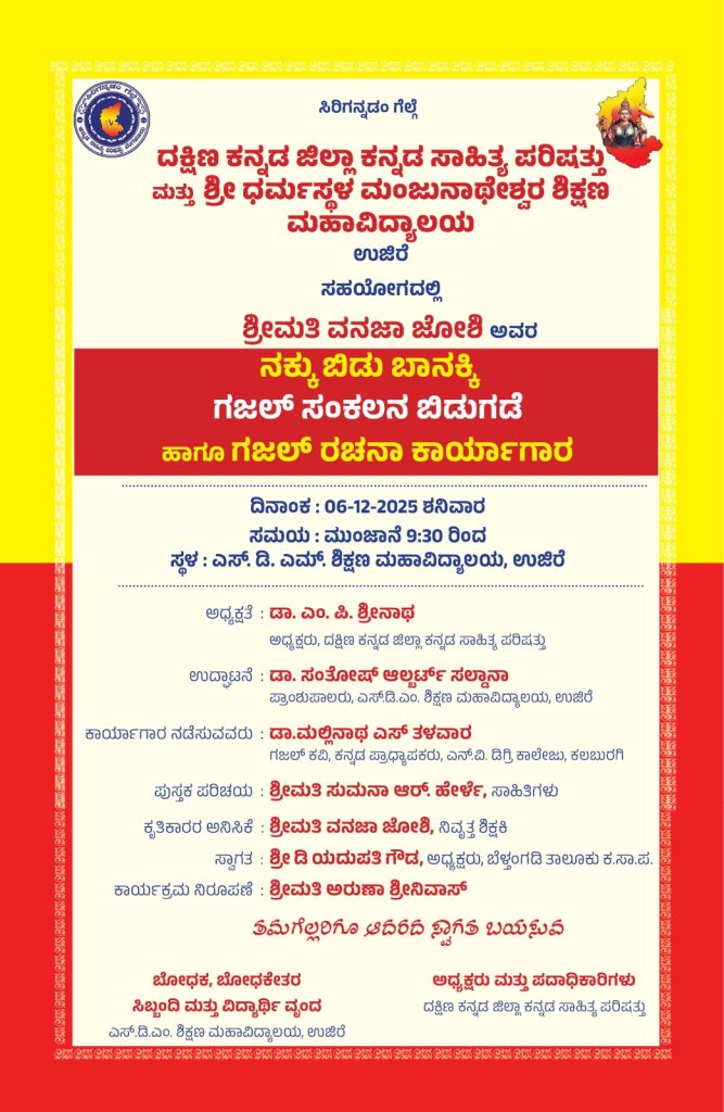 ಉಜಿರೆ : ದಕ್ಷಿಣ ಕನ್ನಡ ಜಿಲ್ಲಾ ಕನ್ನಡ ಸಾಹಿತ್ಯ ಪರಿಷತ್ತು ಮತ್ತು ಶ್ರೀ ಧರ್ಮಸ್ಥಳ ಮಂಜುನಾಥೇಶ್ವರ ಶಿಕ್ಷಣ ಮಹಾವಿದ್ಯಾಲಯ ಉಜಿರೆ ಇವರ ಸಹಯೋಗದಲ್ಲಿ ಶ್ರೀಮತಿ ವನಜಾ ಜೋಶಿ ಇವರ ‘ನಕ್ಕು ಬಿಡು ಬಾನಕ್ಕಿ’ ಗಜಲ್ ಸಂಕಲನ ಬಿಡುಗಡೆ ಮತ್ತು ಗಜಲ್ ರಚನಾ ಕಾರ್ಯಾಗಾರವನ್ನು ದಿನಾಂಕ 06 ಡಿಸೆಂಬರ್ 2025ರಂದು ಮುಂಜಾನೆ 9-30 ಗಂಟೆಗೆ ಉಜಿರೆ ಎಸ್.ಡಿ.ಎಮ್. ಶಿಕ್ಷಣ ಮಹಾವಿದ್ಯಾಲಯದಲ್ಲಿ ಹಮ್ಮಿಕೊಳ್ಳಲಾಗಿದೆ.