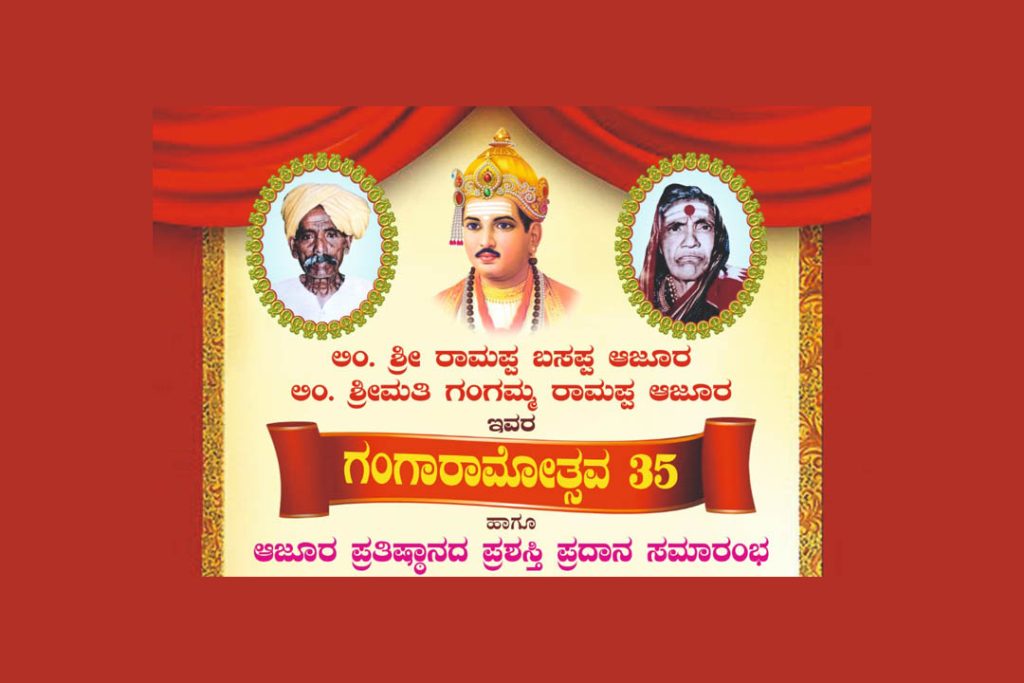 ಬೆಳಗಾವಿ : ಲಿಂ. ಶ್ರೀ ರಾಮಪ್ಪ ಬಸಪ್ಪ ಅಜೂರ ಮತ್ತು ಲಿಂ. ಶ್ರೀಮತಿ ಗಂಗಮ್ಮ ರಾಮಪ್ಪ ಅಜೂರ ಇವರ ಗಂಗಾರಾಮೋತ್ಸವ 35 ಹಾಗೂ ಅಜೂರ ಪ್ರತಿಷ್ಠಾನದ ಪ್ರಶಸ್ತಿ ಪ್ರದಾನ ಸಮಾರಂಭವನ್ನು ದಿನಾಂಕ 26 ಜನವರಿ 2025ರಂದು ಮುಂಜಾನೆ 10-00 ಗಂಟೆಗೆ ಬೆಳಗಾವಿಯ ಅಜೂರ ತೋಟದ ಮಹಾಮನೆಯಲ್ಲಿ ಹಮ್ಮಿಕೊಳ್ಳಲಾಗಿದೆ.