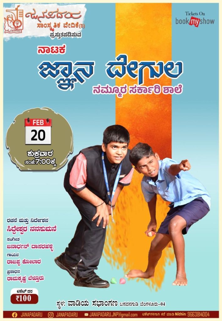 ಬೆಂಗಳೂರು : ಜನಪದರು ಸಾಂಸ್ಕೃತಿಕ ವೇದಿಕೆ (ರಿ.) ಪ್ರಸ್ತುತ ಪಡಿಸುವ ‘ಜ್ಞಾನ ದೇಗುಲ’ ನಮ್ಮೂರ ಸರ್ಕಾರಿ ಶಾಲೆ ನಾಟಕ ಪ್ರದರ್ಶನವನ್ನು ದಿನಾಂಕ 20 ಫೆಬ್ರವರಿ 2026ರಂದು ಸಂಜೆ 7-00 ಗಂಟೆಗೆ ಬೆಂಗಳೂರಿನ ಬಸವನ ಗುಡಿಯಲ್ಲಿರುವ ವಾಡಿಯ ಸಭಾಂಗಣದಲ್ಲಿ ಹಮ್ಮಿಕೊಳ್ಳಲಾಗಿದೆ. ಈ ನಾಟಕಕ್ಕೆ ಸಿದ್ಧೇಶ್ವರ ನನಸುಮನೆ ಇವರ ರಚನೆ ಮತ್ತು ನಿರ್ದೇಶನ, ಜನಾರ್ದನ್ ದಾಸರಹಳ್ಳಿ ಇವರ ಸಂಗೀತ ಹಾಗೂ ರಾಜಪ್ಪ ಕೋಲಾರ ಇವರ ಗಾಯನವಿದೆ.