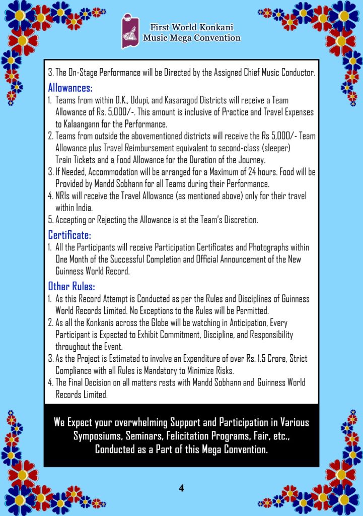 ದಾಖಲೆಯ ಸಂದರ್ಭದಲ್ಲಿ, 16 ವರ್ಷ ಮೀರಿದ 18 ಜನರನ್ನೊಳಗೊಂಡ ಒಂದು ತಂಡವು ಒಂದು ಗಂಟೆಯ ಅವಧಿಯಲ್ಲಿ ಸುಮಾರು 16ರಿಂದ 18 ಹಾಡುಗಳನ್ನು ಹಾಡಲಿದೆ. ಈ ರೀತಿ 300 ತಂಡಗಳು ಒಂದರ ನಂತರ ಒಂದು ನಿರಂತರವಾಗಿ ಹಾಡಿ ಈ ದಾಖಲೆಯನ್ನು ರಚಿಸಲಿವೆ. ಹಾಡುಗಾರರು ಯಾವುದೇ ಭಾಷೆಯವರಾಗಿರಬಹುದು ಆದರೆ ಹಾಡುಗಳು ಮಾತ್ರ ಕೊಂಕಣಿಯದ್ದಾಗಿರಬೇಕು. ಹಿಂದೂ, ಮುಸ್ಲಿಂ, ಕ್ರೈಸ್ತ ಹೀಗೆ ಕೊಂಕಣಿಯ ಎಲ್ಲಾ ಭಾಷಾ ಪ್ರಬೇಧಗಳ ದೇಶ ವಿದೇಶಗಳ ಎಲ್ಲಾ ಮೂಲೆಗಳ ಜನರು ಭಾಗವಹಿಸಬಹುದು. ನೋಂದಾಯಿಸಿದ ತಂಡಗಳಿಗೆ ತರಬೇತಿ ಮತ್ತು ಇತರೆ ಮಾಹಿತಿಯನ್ನು ಮುಂದಿನ ದಿನಗಳಲ್ಲಿ ನೀಡಲಾಗುವುದು. ತಂಡಕ್ಕೆ ಸೂಕ್ತ ಹೆಸರನ್ನಿಟ್ಟು, ತಂಡದ ಮುಖ್ಯಸ್ಥರ ಹೆಸರು ಮತ್ತು ದೂರವಾಣಿ ಸಂಖ್ಯೆಯೊಡನೆ ದಿನಾಂಕ 28 ಫೆಬ್ರವರಿ 2026ಯೊಳಗೆ 81052 26626 ಈ ದೂರವಾಣಿ ಸಂಖ್ಯೆಗೆ ವಾಟ್ಸಪ್ ಮೂಲಕ ನೋಂದಾಯಿಸಬಹುದು. ಹೆಚ್ಚಿನ ಮಾಹಿತಿಗೆ www.manddsobhann.org ಭೇಟಿ ನೀಡಿ.