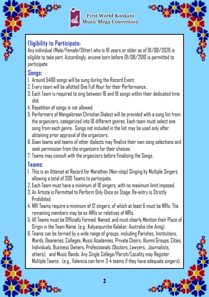 ದಾಖಲೆಯ ಸಂದರ್ಭದಲ್ಲಿ, 16 ವರ್ಷ ಮೀರಿದ 18 ಜನರನ್ನೊಳಗೊಂಡ ಒಂದು ತಂಡವು ಒಂದು ಗಂಟೆಯ ಅವಧಿಯಲ್ಲಿ ಸುಮಾರು 16ರಿಂದ 18 ಹಾಡುಗಳನ್ನು ಹಾಡಲಿದೆ. ಈ ರೀತಿ 300 ತಂಡಗಳು ಒಂದರ ನಂತರ ಒಂದು ನಿರಂತರವಾಗಿ ಹಾಡಿ ಈ ದಾಖಲೆಯನ್ನು ರಚಿಸಲಿವೆ. ಹಾಡುಗಾರರು ಯಾವುದೇ ಭಾಷೆಯವರಾಗಿರಬಹುದು ಆದರೆ ಹಾಡುಗಳು ಮಾತ್ರ ಕೊಂಕಣಿಯದ್ದಾಗಿರಬೇಕು. ಹಿಂದೂ, ಮುಸ್ಲಿಂ, ಕ್ರೈಸ್ತ ಹೀಗೆ ಕೊಂಕಣಿಯ ಎಲ್ಲಾ ಭಾಷಾ ಪ್ರಬೇಧಗಳ ದೇಶ ವಿದೇಶಗಳ ಎಲ್ಲಾ ಮೂಲೆಗಳ ಜನರು ಭಾಗವಹಿಸಬಹುದು. ನೋಂದಾಯಿಸಿದ ತಂಡಗಳಿಗೆ ತರಬೇತಿ ಮತ್ತು ಇತರೆ ಮಾಹಿತಿಯನ್ನು ಮುಂದಿನ ದಿನಗಳಲ್ಲಿ ನೀಡಲಾಗುವುದು. ತಂಡಕ್ಕೆ ಸೂಕ್ತ ಹೆಸರನ್ನಿಟ್ಟು, ತಂಡದ ಮುಖ್ಯಸ್ಥರ ಹೆಸರು ಮತ್ತು ದೂರವಾಣಿ ಸಂಖ್ಯೆಯೊಡನೆ ದಿನಾಂಕ 28 ಫೆಬ್ರವರಿ 2026ಯೊಳಗೆ 81052 26626 ಈ ದೂರವಾಣಿ ಸಂಖ್ಯೆಗೆ ವಾಟ್ಸಪ್ ಮೂಲಕ ನೋಂದಾಯಿಸಬಹುದು. ಹೆಚ್ಚಿನ ಮಾಹಿತಿಗೆ www.manddsobhann.org ಭೇಟಿ ನೀಡಿ.