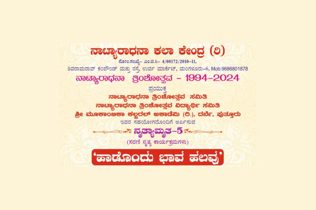 ನಾಟ್ಯಾರಾಧನಾ ತ್ರಿಂಶೋತ್ಸವ ಸಮಿತಿ ಮತ್ತು ನಾಟ್ಯಾರಾಧನಾ ತ್ರಿಂಶೋತ್ಸವ ವಿದ್ಯಾರ್ಥಿ ಸಮಿತಿಯ ಸಹಕಾರದೊಂದಿಗೆ ಪುತ್ತೂರು ದರ್ಬೆಯ ಶ್ರೀ ಮೂಕಾಂಬಿಕಾ ಕಲ್ಚರಲ್ ಅಕಾಡೆಮಿ (ರಿ.) ಇವರ ‘ನೃತ್ಯಾಂತರಂಗ -112’ ಕಾರ್ಯಕ್ರಮದ ಸಹಯೋಗದಲ್ಲಿ ನಡೆಯುವ ಕಾರ್ಯಕ್ರಮವನ್ನು ಖ್ಯಾತ ವಾಸ್ತು ಇಂಜಿನಿಯರ್ ಮತ್ತು ಪುತ್ತೂರಿನ ನಗರ ಸಭಾ ಸದಸ್ಯರಾದ ಶ್ರೀ ಪಿ.ಜಿ. ಜಗನ್ನಿವಾಸ ರಾವ್ ಇವರು ಉದ್ಘಾಟಿಸಲಿದ್ದು, ಯಕ್ಷಗಾನ ಕಲಾವಿದ ಅರ್ಥಧಾರಿ ಶ್ರೀ ಹರೀಶ ಬಳಂತಿಮೊಗರು ಅವರ ಅಧ್ಯಕ್ಷತೆಯಲ್ಲಿ ‘ಹಾಡೊಂದು ಭಾವ ಹಲವು’ ಕಾರ್ಯಕ್ರಮ ಜರುಗಲಿದೆ.