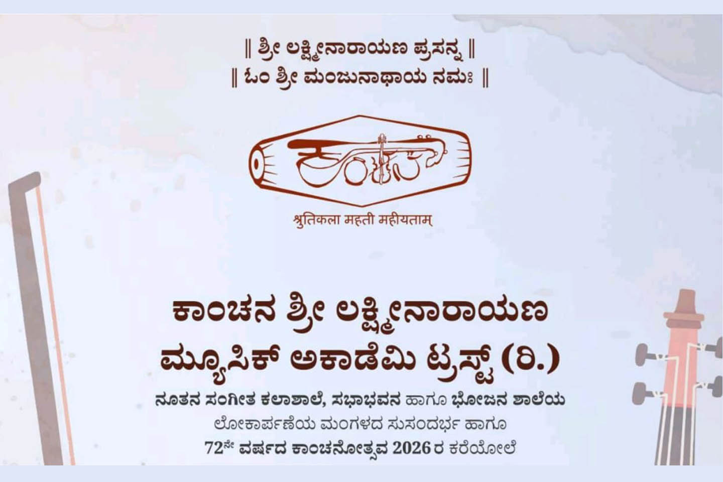 ಪುತ್ತೂರು : ಕಾಂಚನ ಶ್ರೀ ಲಕ್ಷ್ಮೀನಾರಾಯಣ ಮ್ಯೂಸಿಕ್ ಅಕಾಡೆಮಿ ಟ್ರಸ್ಟ್ (ರಿ.) ಇದರ ವತಿಯಿಂದ ಸ್ಥಾಪಕ ಗುರು, ಸಂಗೀತ ರತ್ನ ಋಷಿ ಗಂಧರ್ವ ವಿ. ಕಾಂಚನ ವೆಂಕಟಸುಬ್ರಹ್ಮಣ್ಯಂ ಅವರ 105ನೇ ಜನ್ಮ ವರ್ಷ ಮಹೋತ್ಸವದ ಅಂಗವಾಗಿ ಪುತ್ತೂರು ಕಾಂಚನದಲ್ಲಿ ನಿರ್ಮಾಣವಾಗಿರುವ ನೂತನ ಸಂಗೀತ ಕಲಾ ಶಾಲೆ, ಸಭಾಭವನ ಹಾಗೂ ಭೋಜನ ಶಾಲೆಯ ಲೋಕಾರ್ಪಣೆ, 72ನೇ ವರ್ಷದ ‘ಕಾಂಚನೋತ್ಸವ-2026’ ಕಾರ್ಯಕ್ರಮ ದಿನಾಂಕ 05ರಿಂದ 07 ಫೆಬ್ರುವರಿ 2026ರ ತನಕ ನಡೆಯಲಿದೆ.