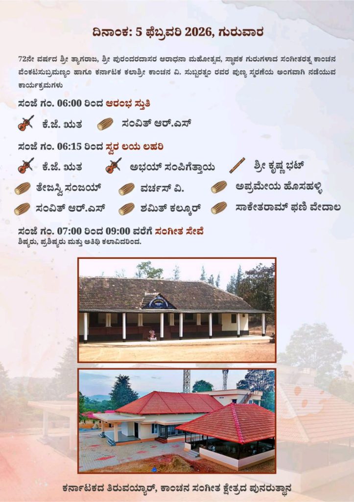 ದಿನಾಂಕ 05 ಫೆಬ್ರುವರಿ 2026ರಂದು 72ನೇ ವರ್ಷದ ಶ್ರೀ ತ್ಯಾಗರಾಜ, ಶ್ರೀ ಪುರಂದರದಾಸರ ಆರಾಧನಾ ಮಹೋತ್ಸವ, ಸ್ಥಾಪಕ ಗುರು, ಸಂಗೀತ ರತ್ನ ಕಾಂಚನ ವೆಂಕಟಸುಬ್ರಮಣ್ಯಂ ಹಾಗೂ ಕರ್ನಾಟಕ ಕಲಾಶ್ರೀ ಕಾಂಚನ ವಿ. ಸುಬ್ಬರತ್ನಂ ಪುಣ್ಯ ಸ್ಮರಣೆಯ ಅಂಗವಾಗಿ ಆರಂಭ ಸ್ತುತಿಯಲ್ಲಿ ಸಂವಿತ್ ಆರ್.ಎಸ್. ಅವರು ತಬಲ, ಕೆ.ಜೆ. ಋತ ವಯಲಿನ್ ನುಡಿಸಲಿದ್ದಾರೆ. ಸಂಜೆ 6-15ರಿಂದ ನಡೆಯುವ ಸ್ವರ ಲಯ ಲಹರಿಯಲ್ಲಿ ಕೆ.ಜೆ. ಋತ, ಅಭಯ್ ಸಂಪಿಗೆತ್ತಾಯ, ಶ್ರೀಕೃಷ್ಣ ಭಟ್, ತೇಜಸ್ವಿ ಸಂಜಯ್, ವರ್ಚಸ್ ವಿ. ಅಪ್ರಮೇಯ ಹೊಸಹಳ್ಳಿ, ಸಂವಿತ್ ಆರ್.ಎಸ್., ಶಮಿತ್ ಕಲ್ಕೂರ್, ಸಾಕೇತರಾಮ್ ಫಣಿ ವೇದಾಲ ಅವರು ಸಂಗೀತ ವಾದ್ಯಗಳನ್ನು ನುಡಿಸಲಿದ್ದಾರೆ. ಸಂಜೆ 7-00ರಿಂದ ಕಾಂಚನ ಶ್ರೀ ಮ್ಯೂಸಿಕ್ ಅಕಾಡೆಮಿ ಶಿಷ್ಯರು, ಪ್ರಶಿಷ್ಯರು ಮತ್ತು ಅತಿಥಿ ಕಲಾವಿದರಿಂದ ಸಂಗೀತ ಸೇವೆ ನಡೆಯಲಿದೆ.