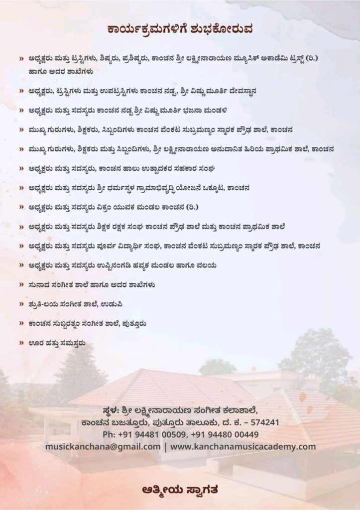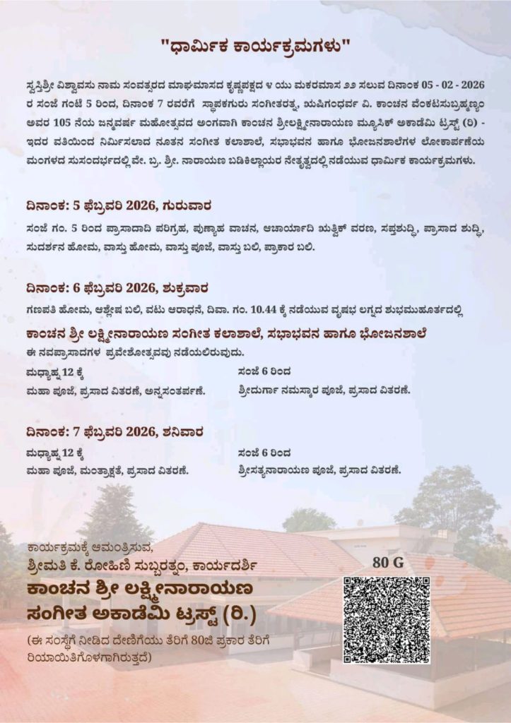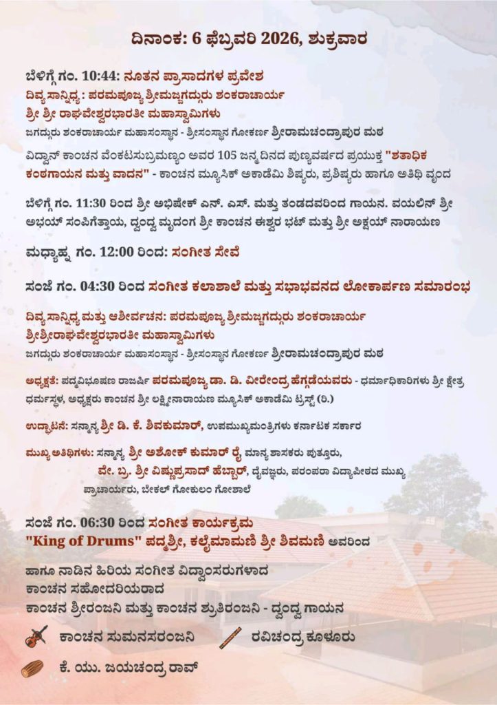 ದಿನಾಂಕ 06 ಫೆಬ್ರುವರಿ 2026ರಂದು ಬೆಳಗ್ಗೆ 10-44ರ ವೇಳೆಗೆ ಶ್ರೀ ಮಜ್ಜಗದ್ಗುರು ಶಂಕರಾಚಾರ್ಯ ಶ್ರೀ ರಾಘವೇಶ್ವರಭಾರತೀ ಮಹಾಸ್ವಾಮಿಗಳ ಉಪಸ್ಥಿತಿಯಲ್ಲಿ ನೂತನವಾಗಿ ನಿರ್ಮಾಣಗೊಂಡಿರುವ ಕಾಂಚನ ಶ್ರೀ ಲಕ್ಷ್ಮೀನಾರಾಯಣ ಸಂಗೀತ ಕಲಾ ಶಾಲೆ, ಸಭಾಭವನ ಹಾಗೂ ಭೋಜನ ಶಾಲೆ ಪ್ರವೇಶೋತ್ಸವ ನಡೆಯಲಿದೆ. ಈ ವೇಳೆ ಕಾಂಚನ ಮ್ಯೂಸಿಕ್ ಅಕಾಡೆಮಿ ಶಿಷ್ಯರು, ಪ್ರಶಿಷ್ಯರು ಹಾಗೂ ರಾಜ್ಯದ ವಿವಿಧೆಡೆಯಿಂದ ಆಗಮಿಸಲಿರುವ ಅತಿಥಿ ವೃಂದದವರಿಂದ ವಿದ್ವಾನ್ ಕಾಂಚನ ವೆಂಕಟ ಸುಬ್ರಹಣ್ಯಂ ಅವರ 105ನೇ ಜನ್ಮದಿನದ ಪುಣ್ಯವರ್ಷದ ಪ್ರಯುಕ್ತ ‘ಶತಾಧಿಕ ಕಂಠಗಾಯನ ಮತ್ತು ವಾದನ’ ನಡೆಯಲಿದೆ. ಬೆಳಗ್ಗೆ 11-30ರಿಂದ ಅಭಿಷೇಕ್ ಎನ್.ಎಸ್. ಮತ್ತು ತಂಡದವರಿಂದ ನಡೆಯುವ ಗಾಯನಕ್ಕೆ ವಯಲಿನ್ ನಲ್ಲಿ ಅಭಯ್ ಸಂಪಿಗೆತ್ತಾಯ, ದ್ವಂದ್ವ ಮೃದಂಗದಲ್ಲಿ ಕಾಂಚನ ಈಶ್ವರ ಭಟ್ ಮತ್ತು ಅಕ್ಷಯ್ ನಾರಾಯಣ ಸಹಕರಿಸಲಿದ್ದಾರೆ. ಮಧ್ಯಾಹ್ನ ಸಂಗೀತ ಸೇವೆ, ಸಂಜೆ 4-30ರಿಂದ ಸಂಗೀತ ಕಲಾಶಾಲೆ ಮತ್ತು ಸಭಾಭವನದ ಲೋಕಾರ್ಪಣಾ ಸಮಾರಂಭ ನಡೆಯಲಿದ್ದು, ಶ್ರೀ ರಾಮಚಂದ್ರಾಪುರ ಮಠದ ಶ್ರೀ ರಾಘವೇಶ್ವರ ಭಾರತೀ ಮಹಾಸ್ವಾಮಿಗಳು ಆಶೀರ್ವಚನ ನೀಡಲಿದ್ದಾರೆ. ಶ್ರೀ ಕ್ಷೇತ್ರ ಧರ್ಮಸ್ಥಳದ ಧರ್ಮಾಧಿಕಾರಿ ಡಾ. ಡಿ. ವೀರೇಂದ್ರ ಹೆಗ್ಗಡೆ ಅಧ್ಯಕ್ಷತೆ ವಹಿಸಲಿದ್ದಾರೆ. ಉಪಮುಖ್ಯಮಂತ್ರಿ ಡಿ.ಕೆ. ಶಿವಕುಮಾರ್ ಉದ್ಘಾಟಿಸಲಿದ್ದಾರೆ. ಮುಖ್ಯ ಅತಿಥಿಗಳಾಗಿ ಶಾಸಕ ಅಶೋಕ್ ಕುಮಾರ್ ರೈ, ಪರಂಪರಾ ವಿದ್ಯಾಪೀಠದ ಮುಖ್ಯ ಪ್ರಾಚಾರ್ಯ ವೇ. ಬ್ರ. ವಿಷ್ಣುಪ್ರಸಾದ್ ಹೆಬ್ಬಾರ್ ಭಾಗವಹಿಸಲಿದ್ದಾರೆ. 6-30ರಿಂದ ‘ಕಿಂಗ್ ಆಫ್ ಡ್ರಮ್ಸ್’ ಪದ್ಮಶ್ರೀ ಕಲೈಮಾಮಣಿ ಶಿವಮಣಿ ಹಾಗೂ ನಾಡಿನ ಹಿರಿಯ ಸಂಗೀತ ವಿದ್ವಾಂಸರಾದ ಕಾಂಚನ ಸಹೋದರಿಯರಾದ ಕಾಂಚನ ಶ್ರೀರಂಜನಿ ಮತ್ತು ಕಾಂಚನ ಶ್ರುತಿರಂಜನಿ ಇವರಿಂದ ದ್ವಂದ್ವ ಗಾಯನ, ಕಾಂಚನ ಸುಮನ ಸರಂಜನಿ, ರವಿಚಂದ್ರ ಕೂಳೂರು, ಕೆ.ಯು. ಜಯಚಂದ್ರ ರಾವ್ ಸಂಗೀತ ವಾದ್ಯ ನುಡಿಸಲಿದ್ದಾರೆ.