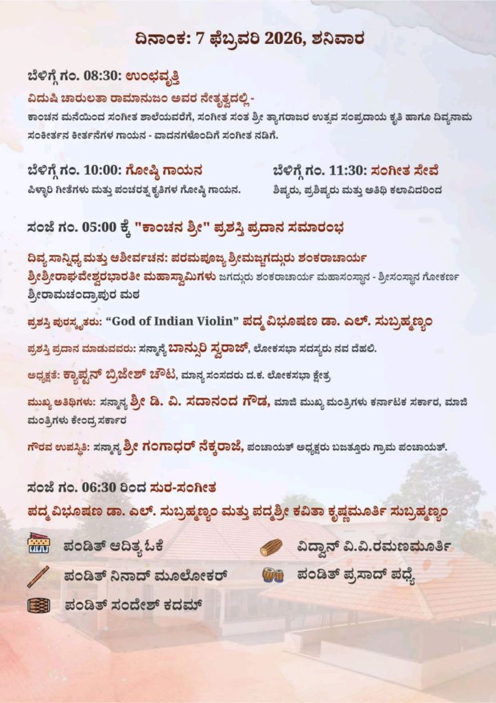ದಿನಾಂಕ 07 ಫೆಬ್ರುವರಿ 2026ರಂದು ಬೆಳಗ್ಗೆ 8-30ಕ್ಕೆ ವಿದುಷಿ ಚಾರುಲತಾ ರಾಮಾನುಜಂ ನೇತೃತ್ವದಲ್ಲಿ ಕಾಂಚನ ಮನೆಯಿಂದ ಸಂಗೀತ ಶಾಲೆಯ ತನಕ, ಉಂಭವೃತ್ತಿ ಸಂಗೀತ ನಡಿಗೆ ನಡೆಯಲಿದೆ. ಬೆಳಗ್ಗೆ 10-00ಕ್ಕೆ ಪಿಳ್ಳಾರಿ ಗೀತೆಗಳು ಮತ್ತು ಪಂಚರತ್ನ ಕೃತಿಗಳ ಗೋಷ್ಠಿ ಗಾಯನ, 11-30ರಿಂದ ಸಂಗೀತ ಸೇವೆ ನಡೆಯಲಿದೆ. ಸಂಜೆ ಗಂಟೆ 5-00 ಕ್ಕೆ ಶ್ರೀ ಮಜ್ಜಗದ್ಗುರು ಶಂಕರಾಚಾರ್ಯ ಶ್ರೀ ರಾಘವೇಶ್ವರ ಭಾರತೀ ಮಹಾಸ್ವಾಮಿಗಳ ಉಪಸ್ಥಿತಿಯಲ್ಲಿ ‘ಗಾಡ್ ಆಫ್ ಇಂಡಿಯನ್ ವಯಲಿನ್’ ಪದ್ಮವಿಭೂಷಣ ಡಾ. ಎಲ್. ಸುಬ್ರಹ್ಮಣ್ಯಂ ಇವರಿಗೆ ‘ಕಾಂಚನ ಶ್ರೀ’ ಪ್ರಶಸ್ತಿ ಪ್ರದಾನ ಸಮಾರಂಭ ನಡೆಯಲಿದ್ದು, ಲೋಕಸಭಾ ಸದಸ್ಯೆ ಬಾನ್ಸುರಿ ಸ್ವರಾಜ್ ಪ್ರಶಸ್ತಿ ಪ್ರದಾನ ಮಾಡಲಿದ್ದಾರೆ. ಸಂಜೆ ಗಂಟೆ 6-30ರಿಂದ ಸುರ-ಸಂಗೀತ ಕಾರ್ಯಕ್ರಮ ಪದ್ಮವಿಭೂಷಣ ಡಾ. ಎಲ್. ಸುಬ್ರಹ್ಮಣ್ಯಂ ಮತ್ತು ಪದ್ಮಶ್ರೀ ಕವಿತಾ ಕೃಷ್ಣಮೂರ್ತಿ ಸುಬ್ರಹ್ಮಣ್ಯಂ ನಡೆಸಿ ಕೊಡಲಿದ್ದಾರೆ. ಪಂಡಿತ್ ಅದಿತ್ಯ ಓ.ಕೆ., ವಿದ್ವಾನ್ ವಿ.ವಿ. ರಮಣಮೂರ್ತಿ, ಪಂಡಿತ್ ನಿನಾದ್ ಮೂಲೋಕರ್, ಪಂಡಿತ್ ಪ್ರಸಾದ್ ಪಧ್ಯೆ. ಪಂಡಿತ್ ಸಂದೇಶ್ ಕದಮ್ ಸಂಗೀತ ವಾದ್ಯಗಳನ್ನು ನುಡಿಸಲಿದ್ದಾರೆ.
