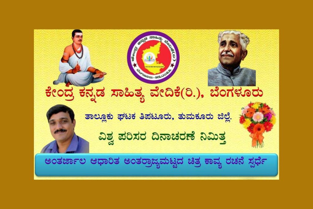 ಬೆಂಗಳೂರು : ಕೇಂದ್ರ ಕನ್ನಡ ಸಾಹಿತ್ಯ ವೇದಿಕೆ (ರಿ.) ಬೆಂಗಳೂರು ಇದರ ತುಮಕೂರು ಜಿಲ್ಲೆ ತಿಪಟೂರು ತಾಲೂಕು ಘಟಕದ ವತಿಯಿಂದ ವಿಶ್ವ ಪರಿಸರ ದಿನಾಚರಣೆ ನಿಮಿತ್ತ ‘ಅಂತರ್ಜಾಲ ಆಧಾರಿತ ಅಂತರ್ರಾಜ್ಯಮಟ್ಟದ ಚಿತ್ರ ಕಾವ್ಯ ರಚನೆ ಸ್ಪರ್ಧೆ’ಯನ್ನು ಹಮ್ಮಿಕೊಳ್ಳಲಾಗಿದೆ.