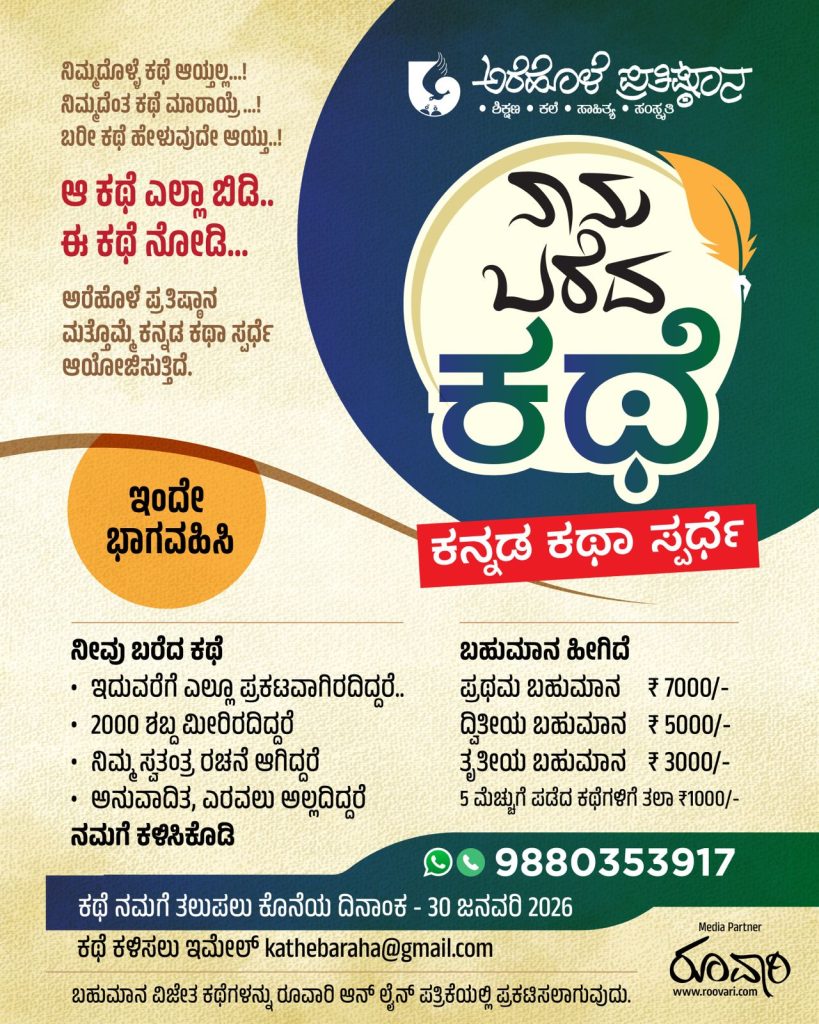 ಮಂಗಳೂರು : ಅರೆಹೊಳೆ ಪ್ರತಿಷ್ಠಾನವು ‘ನಾನು ಬರೆದ ಕಥೆ’ ಎಂಬ ಕನ್ನಡ ಸಣ್ಣ ಕಥಾ ಸ್ಪರ್ಧೆಯನ್ನು ಆಯೋಜಿಸಿದ್ದು, ಕಥೆಗಾರರಿಂದ ಸ್ವರಚಿತ ಅಪ್ರಕಟಿತ ಕಥೆಗಳನ್ನು ಆಹ್ವಾನಿಸಿದೆ. 2000 ಶಬ್ದ ಮಿತಿಯ ಕಥೆಗಳಾಗಿರಬೇಕು. ಆಯ್ಕೆಯಾದ ಕಥೆಗಳಿಗೆ ಪ್ರಥಮ, ದ್ವಿತೀಯ ಮತ್ತು ತೃತೀಯ ಬಹುಮಾನಗಳಿದ್ದು ಅನುಕ್ರಮವಾಗಿ ರೂ.7000/-, ರೂ.5000/- ಮತ್ತು ರೂ.3,000/- ನಗದು, ಪ್ರಶಸ್ತಿ ಪತ್ರ ನೀಡಲಾಗುವುದು. ತೀರ್ಪುಗಾರರ ಮೆಚ್ಚುಗೆ ಪಡೆದ ಐದು ಕಥೆಗಳಿಗೆ ತಲಾ ರೂ.1000/- ಬಹುಮಾನವಿರುತ್ತದೆ. ಕಥೆ ಕಳಿಸಲು ಕೊನೆಯ ದಿನ ಜನವರಿ 30 ಎಂದು ಪ್ರತಿಷ್ಠಾನದ ಗೌರವಾಧ್ಯಕ್ಷ ಡಾ. ಹರಿಕೃಷ್ಣ ಪುನರೂರು ತಿಳಿಸಿದ್ದಾರೆ.