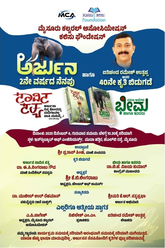 ಮೈಸೂರು : ಮೈಸೂರು ಕಲ್ಚರಲ್ ಅಸೋಸಿಯೇಷನ್ ಹಾಗೂ ಕಲಿಸು ಫೌಂಡೇಷನ್ ವತಿಯಿಂದ ಮೈಸೂರಿನ ಇನ್ಸ್ಟಿಟ್ಯೂಟ್ ಆಫ್ ಎಂಜಿನಿಯರ್ಸ್ನಲ್ಲಿ ದಸರಾ ಆನೆ ಅರ್ಜುನನ ಎರಡನೇ ವರ್ಷದ ನೆನಪು ಹಾಗೂ ಪತ್ರಕರ್ತ ಐತಿಚಂಡ ರಮೇಶ್ ಉತ್ತಪ್ಪ ಇವರ ಎರಡು ಕೃತಿಗಳ ಲೋಕಾರ್ಪಣೆ ಕಾರ್ಯಕ್ರಮ ದಿನಾಂಕ 04 ಡಿಸೆಂಬರ್ 2025ರಂದು ಬೆಳಗ್ಗೆ 10-30ಕ್ಕೆ ನಡೆಯಲಿದೆ.