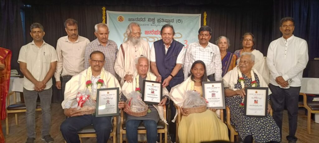 ಬೆಂಗಳೂರು : ಹೊನ್ನಾವರದ ಜಾನಪದ ವಿಶ್ವಪ್ರತಿಷ್ಠಾನ, ಅಭಿನವ ಬಳಗ, ಪ್ರಣತಿ ದೊಡ್ಡಹೊಂಡ ಮತ್ತು ಬುಕ್ ಬ್ರಹ್ಮ ಸಹಯೋಗದಲ್ಲಿ ಏರ್ಪಡಿಸಿದ್ದ ‘ಜನಪದ ದೀಪಾರಾಧನೆ 43’ ಪ್ರಶಸ್ತಿ ಪ್ರದಾನ, ಧ್ವನಿ ಸಾಂದ್ರಿಕೆ ಹಾಗೂ ಪುಸ್ತಕ ಲೋಕಾರ್ಪಣೆ ಸಮಾರಂಭವು ದಿನಾಂಕ 05-09-2023ರಂದು ಬೆಂಗಳೂರಿನ ರೇಸ್ ಕೋರ್ಸ್ ರಸ್ತೆಯಲ್ಲಿನ ಭಾರತೀಯ ವಿದ್ಯಾಭವನದ ಕೆ.ಆರ್.ಜಿ. ಹಾಲ್ ಇಲ್ಲಿ ನಡೆಯಿತು.