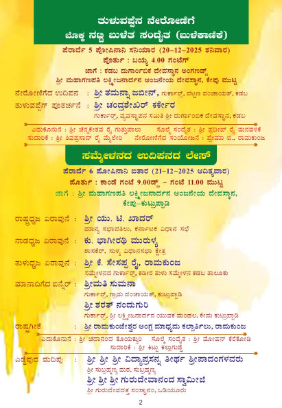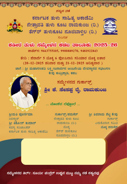 ಕಡಬ : ಕರ್ನಾಟಕ ತುಳು ಸಾಹಿತ್ಯ ಅಕಾಡೆಮಿ, ನೇತ್ರಾವತಿ ತುಳು ಕೂಟ ರಾಮಕುಂಜ (ರಿ.) ಮತ್ತು ತೆಗ್ ರ್ ತುಳುಕೂಟ ನೂಜಿಬಾಳ್ತಿಲ (ರಿ.) ಇವರ ಸಹಯೋಗದಲ್ಲಿ ‘ಕಡಬ ತಾಲೂಕು ಪ್ರಥಮ ತುಳು ಸಮ್ಮೇಳನ’ವನ್ನು ದಿನಾಂಕ 20 ಮತ್ತು 21 ಡಿಸೆಂಬರ್ 2025ರಂದು ಕುಟ್ರುಪ್ಪಾಡಿ ಗ್ರಾಮದ ಕೇಪು ಶ್ರೀ ಮಹಾಗಣಪತಿ ಲಕ್ಷ್ಮೀ ಜನಾರ್ದನ ಆಂಜನೇಯ ದೇವಸ್ಥಾನದ ಸಭಾಂಗಣದಲ್ಲಿ ಹಮ್ಮಿಕೊಳ್ಳಲಾಗಿದೆ.