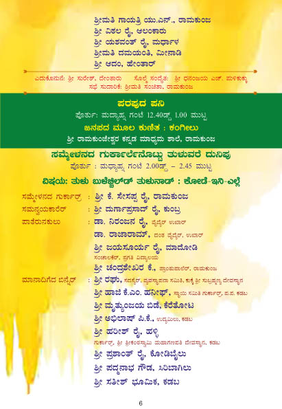 11-00 ಗಂಟೆಗೆ ಜನಪದ ಮೂಲ ಕುಣಿತ – ಕನ್ಯಾಪು ಬೊಕ್ಕ ಮಾದಿರ ನಲಿಕೆ, 11-10ಕ್ಕೆ ವಿಚಾರಗೋಷ್ಠಿ – ಗೇನದ ನಡೆ ಇದರ ಅಧ್ಯಕ್ಷತೆಯನ್ನು ಕರ್ನಾಟಕ ತುಳು ಸಾಹಿತ್ಯ ಅಕಾಡೆಮಿಯ ಮಾಜಿ ರಿಜಿಸ್ಟ್ರಾರ್ ಚಂದ್ರಹಾಸ ರೈ ಬಿ. ಇವರು ವಹಿಸಲಿದ್ದಾರೆ. ಶ್ರೀಮತಿ ಸರಿತಾ ಜನಾರ್ದನ್ ಮತ್ತು ಶ್ರೀಮತಿ ಅಕ್ಷತಾ ಶೇಖರ್ ಇವರ ‘ಗೇನದ ಗುಂಡೊಡು ಬರವುದ ಬೊಲ್ಪು’ ಪುಸ್ತಕ ಬಿಡುಗಡೆಗೊಳ್ಳಲಿದೆ. ಗಂಟೆ 11-50ಕ್ಕೆ ಜನಪದ ಮೂಲ ಕುಣಿತ – ‘ಕರಂಗೋಲು’, 12-00 ಗಂಟೆಗೆ ‘ಕಬಿ ಬೊಕ್ಕ ಕಥಾಗೋಷ್ಠಿ’ ಲೇಖಕಿ ಶ್ರೀಮತಿ ಅಕ್ಷತಾರಾಜ್ ಪೆರ್ಲ ಇವರ ಅಧ್ಯಕ್ಷತೆಯಲ್ಲಿ ನಡೆಯಲಿದೆ. 12-40 ಗಂಟೆಗೆ ಜನಪದ ಮೂಲ ಕುಣಿತ – ‘ಕಂಗೀಲು’. 2-00 ಗಂಟೆಗೆ ‘ತುಳು ಬುಳೆಚ್ಚಿಲ್ ಡ್ ತುಳುನಾಡ್ : ಕೋಡೆ-ಇನಿ-ಎಲ್ಲೆ’ ಸಮ್ಮೇಳನಾಧ್ಯಕ್ಷರೊಂದಿಗೆ ಮಾತುಕತೆ, ವಿವಿಧ ಕ್ಷೇತ್ರದ ಸಾಧಕರನ್ನು ಸನ್ಮಾನಿಸಲಾಗುವುದು. ಸಂಜೆ ಗಂಟೆ 3-45ಕ್ಕೆ ಜನಪದ ಮೂಲ ಕುಣಿತ – ಚೆನ್ನು ಕುಣಿತ ಮತ್ತು 4-00 ಗಂಟೆಗೆ ಸಮಾರೋಪ ಸಮಾರಂಭದಲ್ಲಿ ಜನಪದ ಸ್ಪರ್ಧೆಗಳ ಬಹುಮಾನ ವಿತರಣೆ ನಡೆಯಲಿದೆ.