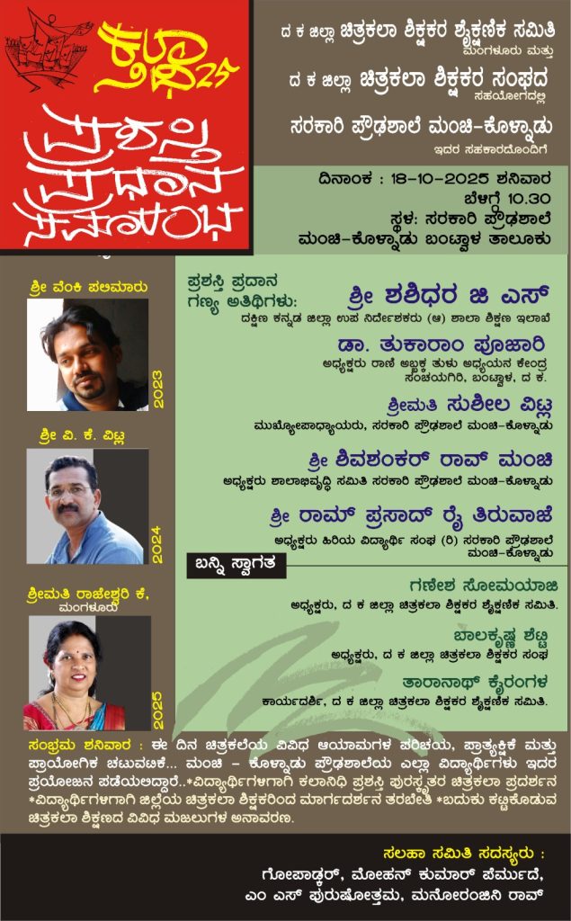 ಬಂಟ್ವಾಳ : ದ. ಕ. ಜಿಲ್ಲಾ ಚಿತ್ರಕಲಾ ಶಿಕ್ಷಕರ ಶೈಕ್ಷಣಿಕ ಸಮಿತಿ ಮಂಗಳೂರು ಮತ್ತು ದ. ಕ. ಜಿಲ್ಲಾ ಚಿತ್ರಕಲಾ ಶಿಕ್ಷಕರ ಸಂಘದ ಸಹಯೋಗದಲ್ಲಿ ಸರಕಾರಿ ಪ್ರೌಢ ಶಾಲೆ ಮಂಚಿ ಕೊಳ್ನಾಡು ಇದರ ಸಹಯೋಗದೊಂದಿಗೆ ‘ಕಲಾ ನಿಧಿ’ ಪ್ರಶಸ್ತಿ ಪ್ರದಾನ ಕಾರ್ಯಕ್ರಮವನ್ನು ದಿನಾಂಕ 18 ಅಕ್ಟೋಬರ್ 2025ರಂದು ಬೆಳಿಗ್ಗೆ 10-30 ಗಂಟೆಗೆ ಬಂಟ್ವಾಳ ತಾಲೂಕಿನ ಮಂಚಿ ಕೊಳ್ನಾಡು ಸರಕಾರಿ ಪ್ರೌಢ ಶಾಲೆಯಲ್ಲಿ ಹಮ್ಮಿಕೊಳ್ಳಲಾಗಿದೆ.