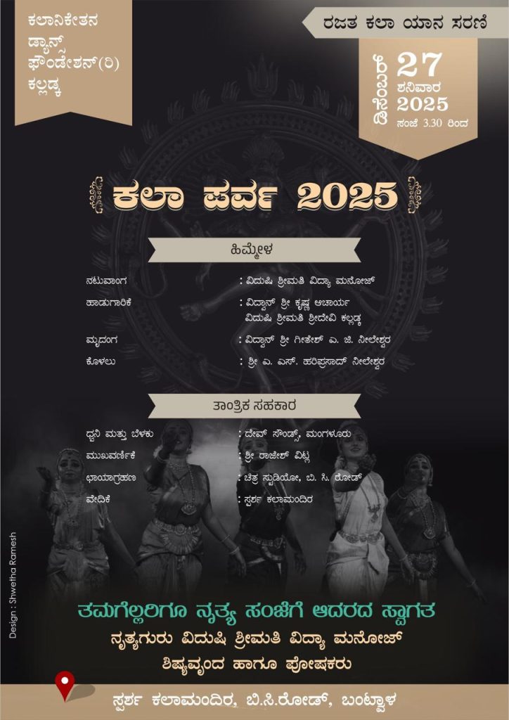ಬಂಟ್ವಾಳ : ಕಲಾನಿಕೇತನ ಡಾನ್ಸ್ ಫೌಂಡೇಷನ್ ಕಲ್ಲಡ್ಕ ಇವರು ಪ್ರಸ್ತುತ ಪಡಿಸುವ ‘ರಜತ ಕಲಾ ಯಾನ’ದ ಸರಣಿ ‘ಕಲಾ ಪರ್ವ 2025’ವನ್ನು ದಿನಾಂಕ 27 ಡಿಸೆಂಬರ್ 2025ರಂದು ಸಂಜೆ 3-30 ಗಂಟೆಗೆ ಬಂಟ್ವಾಳ ಬಿ.ಸಿ. ರೋಡಿನಲ್ಲಿರುವ ಸ್ಪರ್ಶ ಕಲಾಮಂದಿರದಲ್ಲಿ ಹಮ್ಮಿಕೊಳ್ಳಲಾಗಿದೆ.