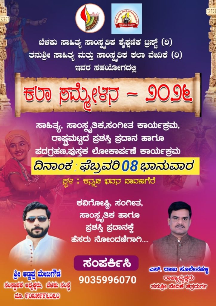 ದಾವಣಗೆರೆ : ಬೆಳಕು ಸಾಹಿತ್ಯ ಸಾಂಸ್ಕೃತಿಕ ಶೈಕ್ಷಣಿಕ ಟ್ರಸ್ಟ್ (ರಿ.) ಹಾಗೂ ತನುಶ್ರೀ ಸಾಹಿತ್ಯ ಮತ್ತು ಸಾಂಸ್ಕೃತಿಕ ಕಲಾ ವೇದಿಕೆ (ರಿ.) ಇವರ ಸಹಯೋಗದಲ್ಲಿ ‘ಕಲಾ ಸಮ್ಮೇಳನ – 2026’ ಕಾರ್ಯಕ್ರಮವನ್ನು ದಿನಾಂಕ 08 ಫೆಬ್ರವರಿ 2026ರಂದು ದಾವಣಗೆರೆಯ ಕನ್ನಡ ಭವನದಲ್ಲಿ ಹಮ್ಮಿಕೊಳ್ಳಲಾಗಿದ್ದು, ಸಾಹಿತ್ಯ, ಸಾಂಸ್ಕೃತಿಕ, ಸಂಗೀತ ಕಾರ್ಯಕ್ರಮ, ರಾಷ್ಟ್ರಮಟ್ಟದ ಪ್ರಶಸ್ತಿ ಪ್ರದಾನ ಹಾಗೂ ಪುಸ್ತಕ ಲೋಕಾರ್ಪಣೆ ಕಾರ್ಯಕ್ರಮ ಅದ್ದೂರಿಯಾಗಿ ನಡೆಯಲಿದೆ.