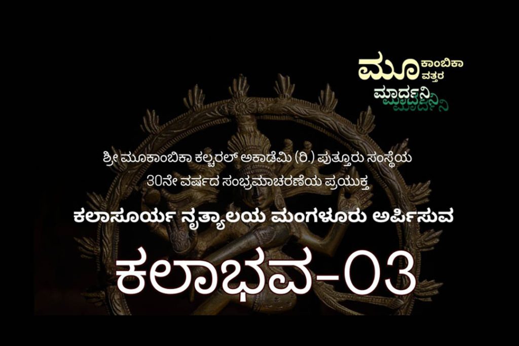 ಮಂಗಳೂರು : ಶ್ರೀ ಮೂಕಾಂಬಿಕಾ ಕಲ್ಚರಲ್ ಅಕಾಡೆಮಿ (ರಿ.) ಪುತ್ತೂರು ಸಂಸ್ಥೆಯ 30ನೇ ವರ್ಷದ ಸಂಭ್ರಮಾಚರಣೆಯ ಪ್ರಯುಕ್ತ ‘ಮೂಕಾಂಬಿಕಾ ಮೂವತ್ತರ ಮಾರ್ದನಿ’ ಶೀರ್ಷಿಕೆಯಲ್ಲಿ ಮಂಗಳೂರಿನ ಕಲಾಸೂರ್ಯ ನೃತ್ಯಾಲಯ ಪ್ರಸ್ತುತ ಪಡಿಸುವ ‘ಕಲಾಭವ -03’ ಪ್ರಸ್ತುತಿಯನ್ನು ದಿನಾಂಕ 12 ಅಕ್ಟೋಬರ್ 2025ರಂದು ಸಂಜೆ 5-30 ಗಂಟೆಗೆ ಮಂಗಳೂರಿನ ಜೈಲ್ ರೋಡ್, ಮೊದಲನೇ ಮಹಡಿ ಸುಬ್ರಹ್ಮಣ್ಯ ಸದನದಲ್ಲಿ ಹಮ್ಮಿಕೊಳ್ಳಲಾಗಿದೆ.