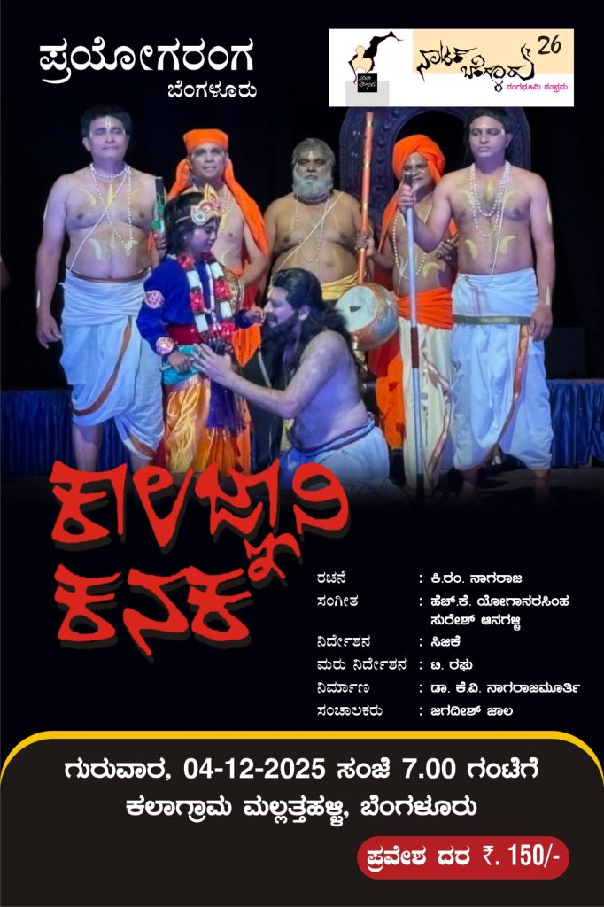 ಬೆಂಗಳೂರು : ಪ್ರಯೋಗರಂಗ ಬೆಂಗಳೂರು ಇವರು ಪ್ರಸ್ತುತ ಪಡಿಸುವ ‘ಕಾಲಜ್ಞಾನಿ ಕನಕ’ ನಾಟಕ ಪ್ರದರ್ಶನವನ್ನು ದಿನಾಂಕ 04 ಡಿಸೆಂಬರ್ 2025ರಂದು ಸಂಜೆ 7-00 ಗಂಟೆಗೆ ಬೆಂಗಳೂರಿನ ಮಲ್ಲತ್ತಹಳ್ಳಿ ಕಲಾಗ್ರಾಮದಲ್ಲಿ ಹಮ್ಮಿಕೊಳ್ಳಲಾಗಿದೆ.