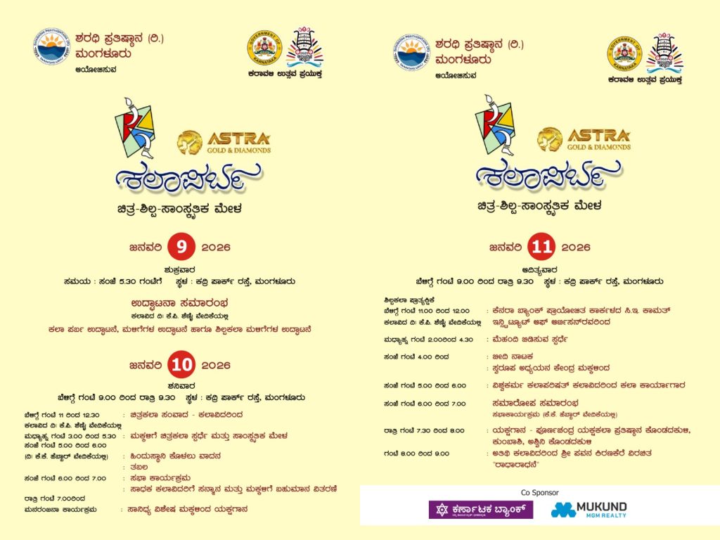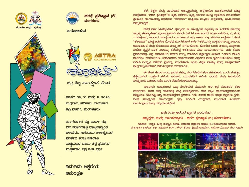 ಮಂಗಳೂರು : ದಕ್ಷಿಣ ಕನ್ನಡ ಜಿಲ್ಲಾಡಳಿತ ಕರಾವಳಿ ಉತ್ಸವ ಪ್ರಯುಕ್ತ ಮಂಗಳೂರಿನ ಶರಧಿ ಪ್ರತಿಷ್ಠಾನ ಆಯೋಜಿಸುವ, ಅಸ್ತ್ರ ಗೋಲ್ಡ್ ಮತ್ತು ಡೈಮಂಡ್ಸ್ ಸಹಕಾರದೊಂದಿಗೆ ‘ಕಲಾಪರ್ಬ’ ಚಿತ್ರ- ಶಿಲ್ಪ- ಸಾಂಸ್ಕೃತಿಕ ಮೇಳವು ಕದ್ರಿ ಪಾರ್ಕಿನಲ್ಲಿ ದಿನಾಂಕ 09ರಿಂದ 11 ಜನವರಿ 2026ರವರೆಗೆ ನಡೆಯಲಿದೆ ಎಂದು ಚಿತ್ರಕಲಾ ಚಾವಡಿಯ ಕಾರ್ಯದರ್ಶಿ ಎಸ್.ಎಂ. ಶಿವಪ್ರಕಾಶ್ ತಿಳಿಸಿದ್ದಾರೆ.