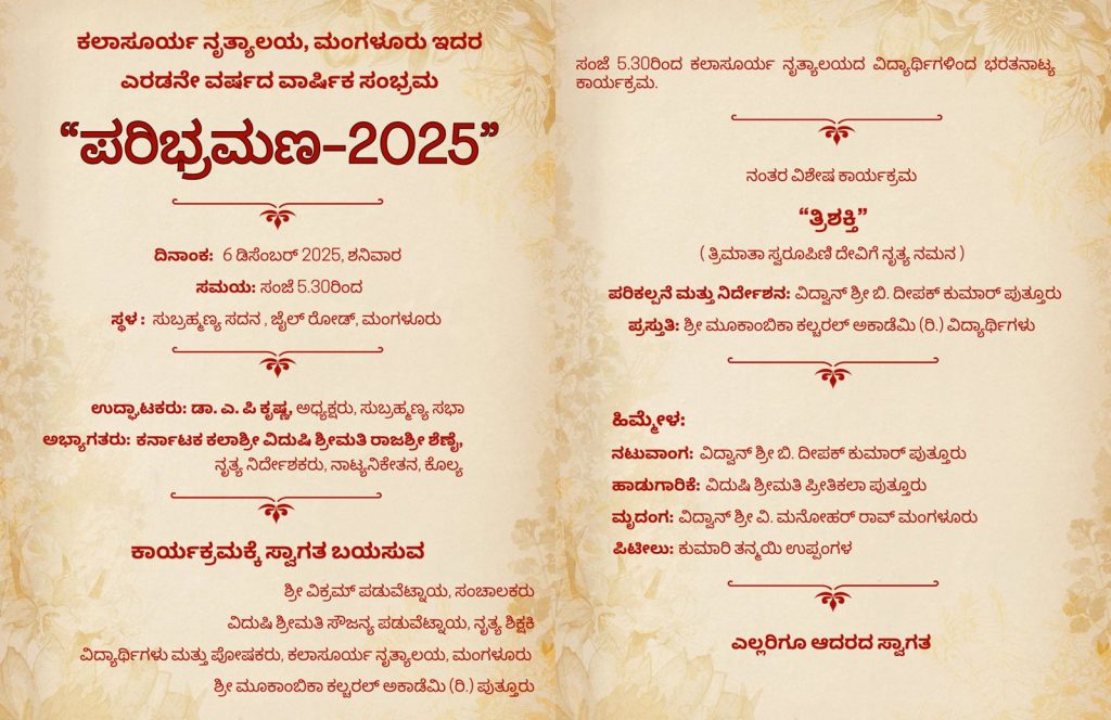 ಮಂಗಳೂರು : ಮಂಗಳೂರಿನ ಕಲಾಸೂರ್ಯ ನೃತ್ಯಾಲಯ ಇದರ ಎರಡನೇ ವರ್ಷದ ವಾರ್ಷಿಕ ಸಂಭ್ರಮದ ಪ್ರಯುಕ್ತ ಪ್ರಸ್ತುತ ಪಡಿಸುವ ‘ಪರಿಭ್ರಮಣ 2025’ ನೃತ್ಯ ಕಾರ್ಯಕ್ರಮವನ್ನು ದಿನಾಂಕ 06 ಡಿಸೆಂಬರ್ 2025ರಂದು ಸಂಜೆ 5-30 ಗಂಟೆಗೆ ಮಂಗಳೂರಿನ ಜೈಲ್ ರೋಡಿನಲ್ಲಿರುವ ಸುಬ್ರಹ್ಮಣ್ಯ ಸದನದಲ್ಲಿ ಹಮ್ಮಿಕೊಳ್ಳಲಾಗಿದೆ.