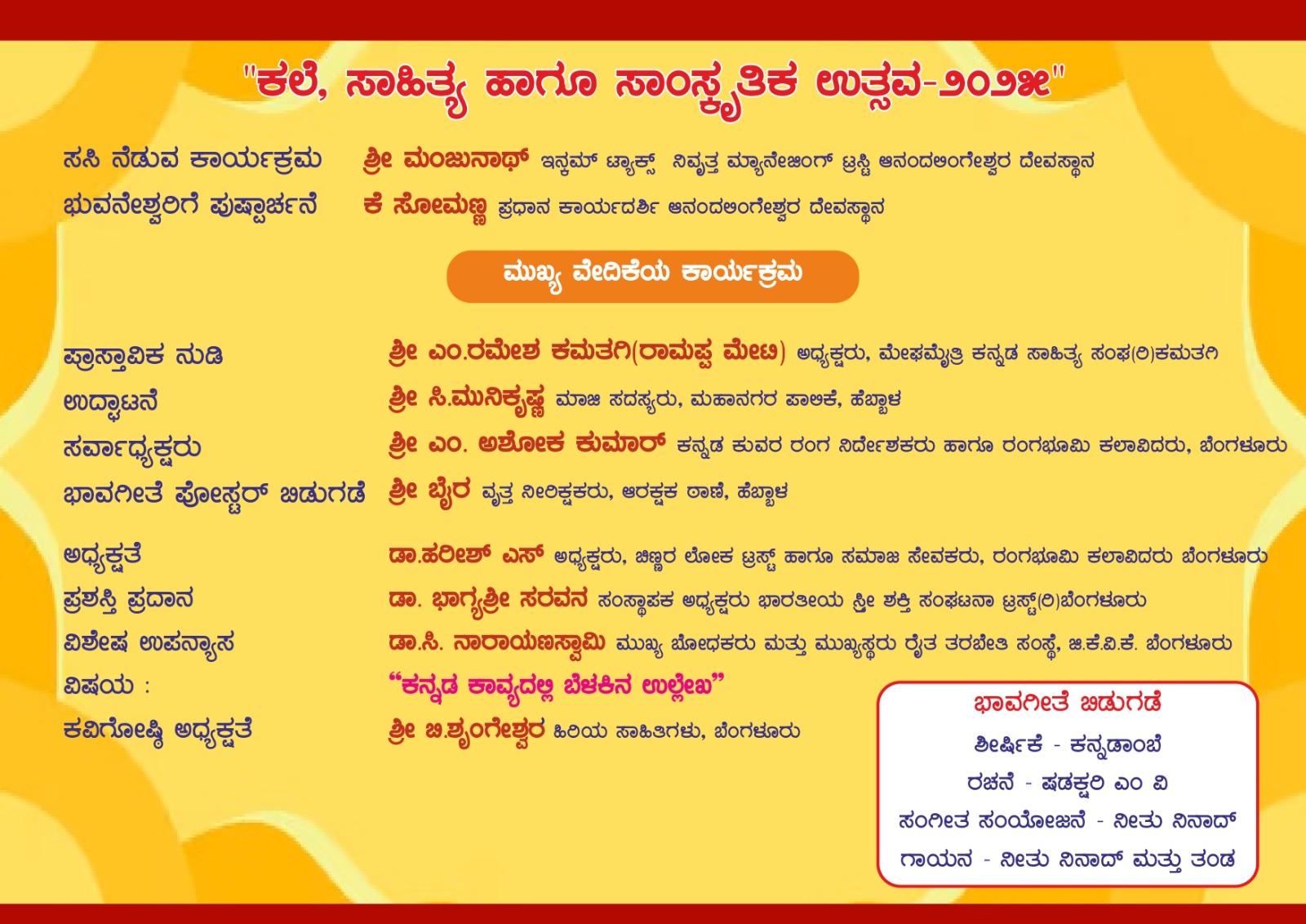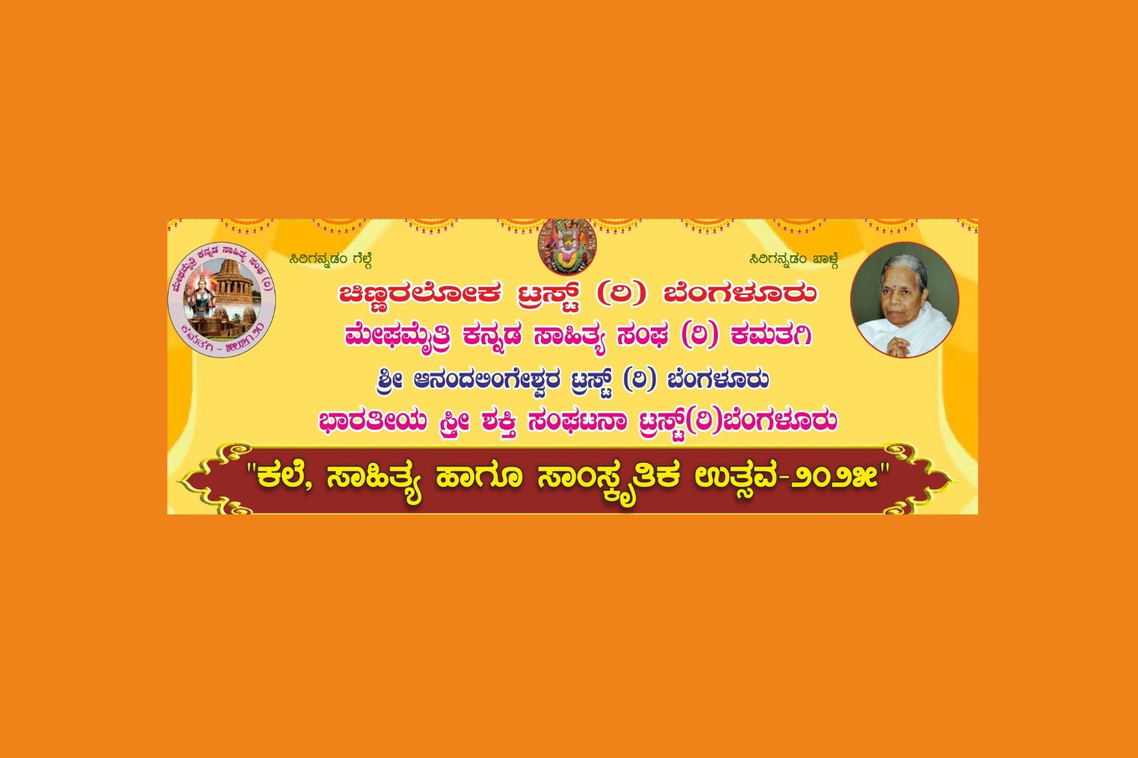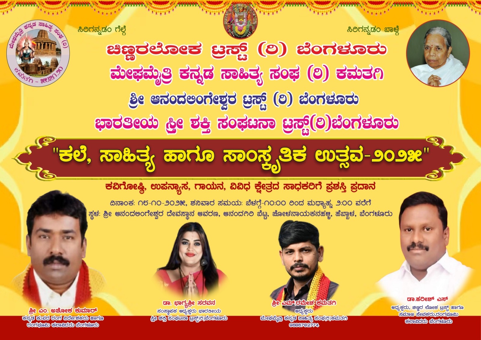 ಬೆಂಗಳೂರು : ಚಿಣ್ಣರಲೋಕ ಟ್ರಸ್ಟ್(ರಿ.) ಬೆಂಗಳೂರು, ಮೇಘಮೈತ್ರಿ ಕನ್ನಡ ಸಾಹಿತ್ಯ ಸಂಘ (ರಿ.) ಕಮತಗಿ, ಶ್ರೀ ಆನಂದ ಲಿಂಗೇಶ್ವರ ಟ್ರಸ್ಟ್ (ರಿ.) ಬೆಂಗಳೂರು, ಭಾರತೀಯ ಸ್ತ್ರೀ ಶಕ್ತಿ ಸಂಘಟನಾ ಟ್ರಸ್ಟ್(ರಿ.) ಬೆಂಗಳೂರು ಜಂಟಿಯಾಗಿ ಆಯೋಜಿಸುವ ಕಲೆ,ಸಾಹಿತ್ಯ ಹಾಗೂ ಸಾಂಸ್ಕೃತಿಕ ಉತ್ಸವ” ಕಾರ್ಯಕ್ರಮವು ದಿನಾಂಕ 18 ಅಕ್ಟೋಬರ್ 2025ರ ಶನಿವಾರ ಬೆಳಗ್ಗೆ ಘಂಟೆ 10:00ಕ್ಕೆ ಬೆಂಗಳೂರು ಹೆಬ್ಬಾಳದಲ್ಲಿರುವ ಶ್ರೀ ಆನಂದಲಿಂಗೇಶ್ವರ ದೇವಸ್ಥಾನದ ಆವರಣದಲ್ಲಿ ನಡೆಯಲಿದೆ