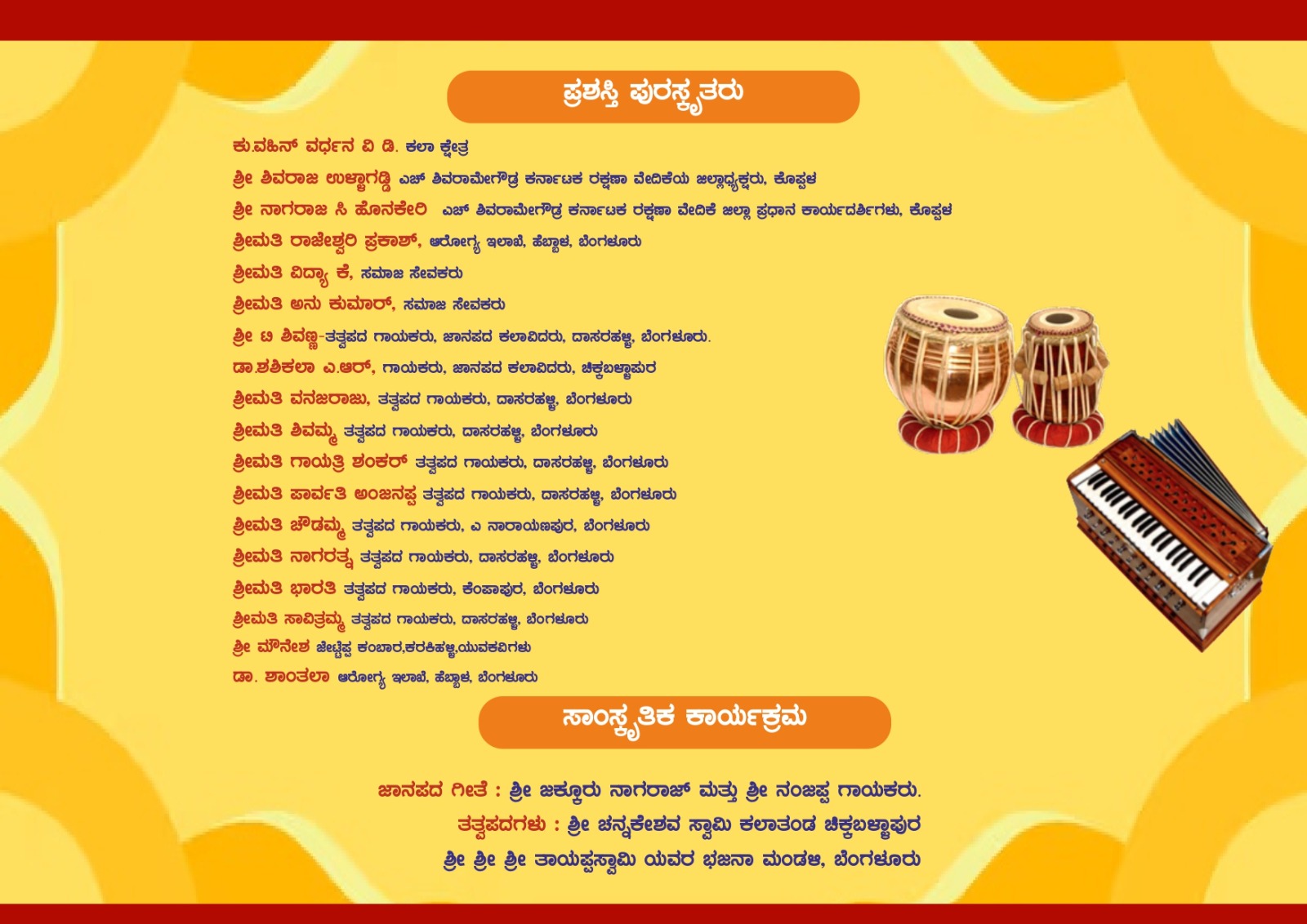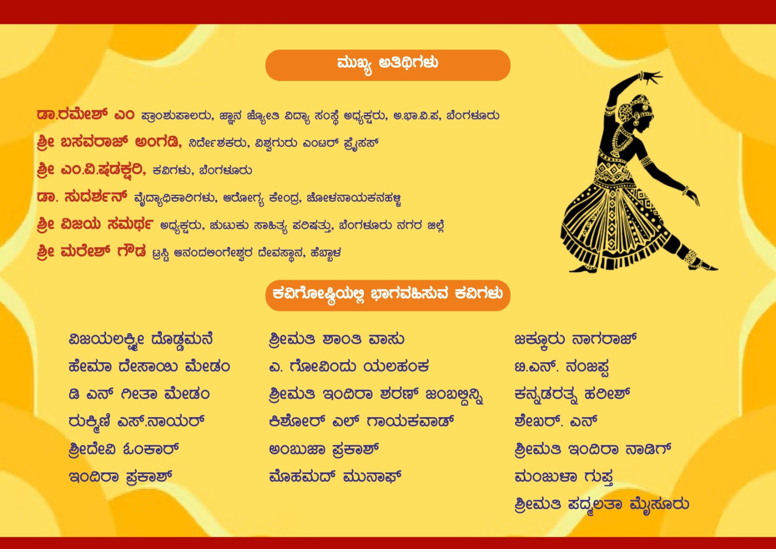 ಈ ಕಾರ್ಯಕ್ರಮದಲ್ಲಿ ಕವಿಗೋಷ್ಠಿ, ಉಪನ್ಯಾಸ, ಪುಸ್ತಕ ಬಿಡುಗಡೆ, ಕಲಾ ಪ್ರದರ್ಶನ ಹಾಗೂ ಸಾಧಕರಿಗೆ ಪ್ರಶಸ್ತಿ ಪ್ರದಾನ ನಡೆಯಲಿದೆ.