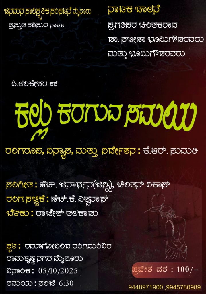 ಮೈಸೂರಿನ ರಮಾಗೋವಿಂದ ರಂಗಮಂದಿರದಲ್ಲಿ ‘ಕಲ್ಲು ಕರಗುವ ಸಮಯ’ ನಾಟಕ ಪ್ರದರ್ಶನ | ಅಕ್ಟೋಬರ್ 05