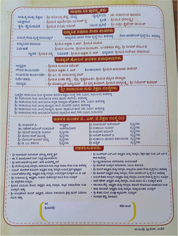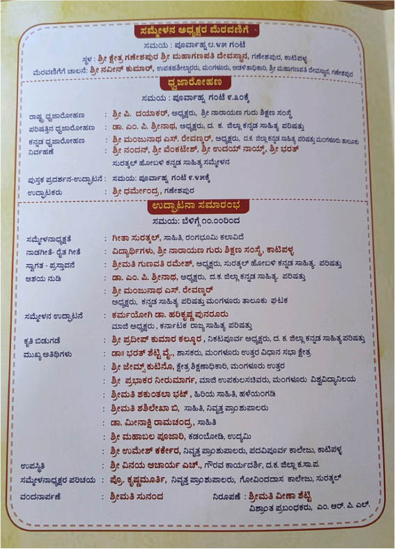ಪೂರ್ವಾಹ್ನ 9-30 ಗಂಟೆಗೆ ಶ್ರೀ ನಾರಾಯಣ ಗುರು ಶಿಕ್ಷಣ ಸಂಸ್ಥೆಯ ಅಧ್ಯಕ್ಷರಾದ ಪಿ. ದಯಾಕರ್ ಇವರಿಂದ ರಾಷ್ಟ್ರ ಧ್ವಜಾರೋಹಣ, ದಕ್ಷಿಣ ಕನ್ನಡ ಜಿಲ್ಲಾ ಕನ್ನಡ ಸಾಹಿತ್ಯ ಪರಿಷತ್ತು ಅಧ್ಯಕ್ಷರಾದ ಡಾ. ಎಂ.ಪಿ. ಶ್ರೀನಾಥ ಇವರಿಂದ ಪರಿಷತ್ತಿನ ಧ್ವಜಾರೋಹಣ, ಕ.ಸಾ.ಪ. ಮಂಗಳೂರು ತಾಲೂಕು ಇದರ ಅಧ್ಯಕ್ಷರಾದ ಶ್ರೀ ಮಂಜುನಾಥ ಎಸ್. ರೇವಣ್ಕರ್ ಇವರು ಕನ್ನಡ ಧ್ವಜಾರೋಹಣ ಹಾಗೂ ಗಣೇಶಪುರ ಧರ್ಮೇಂದ್ರ ಇವರು ಪುಸ್ತಕ ಪ್ರದರ್ಶನ ಉದ್ಘಾಟನೆ ಮಾಡಲಿದ್ದಾರೆ. ಸಾಹಿತಿ ರಂಗಭೂಮಿ ಕಲಾವಿದೆ ಗೀತಾ ಸುರತ್ಕಲ್ ಇವರು ಸಮ್ಮೇಳನಾಧ್ಯಕ್ಷತೆ ವಹಿಸಲಿದ್ದು, ಕರ್ಮಯೋಗಿ ಡಾ. ಹರಿಕೃಷ್ಣ ಪುನರೂರು ಇವರು ಸಮ್ಮೇಳನದ ಉದ್ಘಾಟನೆ ಮಾಡಲಿದ್ದಾರೆ. ಡಾ. ಎಂ.ಪಿ. ಶ್ರೀನಾಥ ಮತ್ತು ಶ್ರೀ ಮಂಜುನಾಥ ಎಸ್. ರೇವಣ್ಕರ್ ಇವರು ಆಶಯ ನುಡಿಗಳನ್ನಾಡಲಿದ್ದು, ದಕ್ಷಿಣ ಕನ್ನಡ ಜಿಲ್ಲಾ ಕನ್ನಡ ಸಾಹಿತ್ಯ ಪರಿಷತ್ತಿನ ನಿಕಟ ಪೂರ್ವ ಅಧ್ಯಕ್ಷರಾದ ಪ್ರದೀಪ್ ಕುಮಾರ ಕಲ್ಕೂರ ಇವರು ಕೃತಿ ಬಿಡುಗಡೆ ಮಾಡಲಿದ್ದಾರೆ.