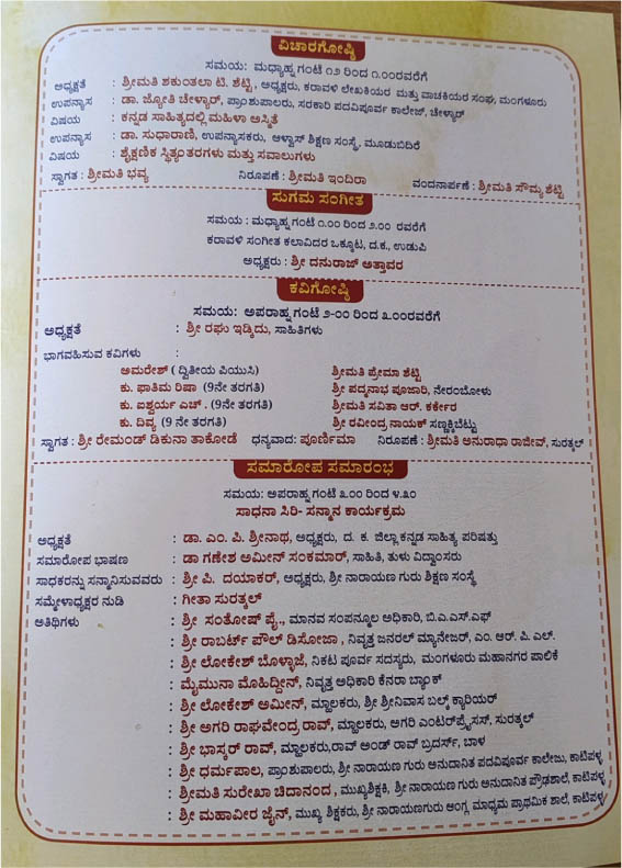 2-00 ಗಂಟೆಗೆ ಕರಾವಳಿ ಲೇಖಕಿಯರ ಮತ್ತು ವಾಚಕಿಯರ ಸಂಘದ ಅಧ್ಯಕ್ಷರಾದ ಶ್ರೀಮತಿ ಶಕುಂತಲಾ ಟಿ. ಶೆಟ್ಟಿ ಇವರು ಅಧ್ಯಕ್ಷತೆಯಲ್ಲಿ ನಡೆಯುವ ವಿಚಾರಗೋಷ್ಠಿಯಲ್ಲಿ ‘ಕನ್ನಡ ಸಾಹಿತ್ಯದಲ್ಲಿ ಮಹಿಳಾ ಅಸ್ಮಿತೆ’ ಎಂಬ ವಿಷಯದ ಬಗ್ಗೆ ಸರಕಾರಿ ಪದವು ಪೂರ್ವ ಕಾಲೇಜಿನ ಪ್ರಾಂಶುಪಾಲರಾದ ಡಾ. ಜ್ಯೋತಿ ಚೇಳ್ಯಾರು ಮತ್ತು ‘ಶೈಕ್ಷಣಿಕ ಸ್ಥಿತ್ಯಂತರಗಳು ಮತ್ತು ಸವಾಲುಗಳು’ ಎಂಬ ವಿಷಯದ ಬಗ್ಗೆ ಮೂಡುಬಿದಿರೆ ಆಳ್ವಾಸ್ ಕಾಲೇಜಿನ ಉಪನ್ಯಾಸಕಿ ಡಾ. ಸುಧಾರಾಣಿ ಇವರು ವಿಷಯ ಮಂಡನೆ ಮಾಡಲಿದ್ದಾರೆ. ಕರಾವಳಿ ಸಂಗೀತ ಕಲಾವಿದರ ಒಕ್ಕೂಟ ದ.ಕ. ಮತ್ತು ಉಡುಪಿ ಜಿಲ್ಲೆ ಇವರಿಂದ ಸುಗಮ ಸಂಗೀತ ಪ್ರಸ್ತುತಗೊಳ್ಳಲಿದೆ. ಅಪರಾಹ್ನ 2-00 ಗಂಟೆಗೆ ಸಾಹಿತಿ ರಘು ಇಡ್ಕಿದು ಇವರ ಅಧ್ಯಕ್ಷತೆಯಲ್ಲಿ ಕವಿಗೋಷ್ಠಿ ನಡೆಯಲಿದೆ. 3-00 ಗಂಟೆಗೆ ದಕ್ಷಿಣ ಕನ್ನಡ ಜಿಲ್ಲಾ ಕನ್ನಡ ಸಾಹಿತ್ಯ ಪರಿಷತ್ತು ಅಧ್ಯಕ್ಷರಾದ ಡಾ. ಎಂ.ಪಿ. ಶ್ರೀನಾಥ ಇವರ ಅಧ್ಯಕ್ಷತೆಯಲ್ಲಿ ನಡೆಯುವ ಸಮಾರೋಪ ಸಮಾರಂಭದಲ್ಲಿ ಸಾಹಿತಿ ಡಾ. ಗಣೇಶ ಅಮೀನ್ ಸಂಕಮಾರ್ ಇವರು ಸಮಾರೋಪ ಭಾಷಣ ಮಾಡಲಿದ್ದಾರೆ. ಇದೇ ಸಂದರ್ಭದಲ್ಲಿ ವಿವಿಧ ಕ್ಷೇತ್ರಗಳಲ್ಲಿ ಸಾಧನೆ ಮಾಡಿದ ಸಾಧಕರನ್ನು ಪ್ರಶಸ್ತಿ ನೀಡಿ ಸನ್ಮಾನಿಸಲಾಗುವುದು.