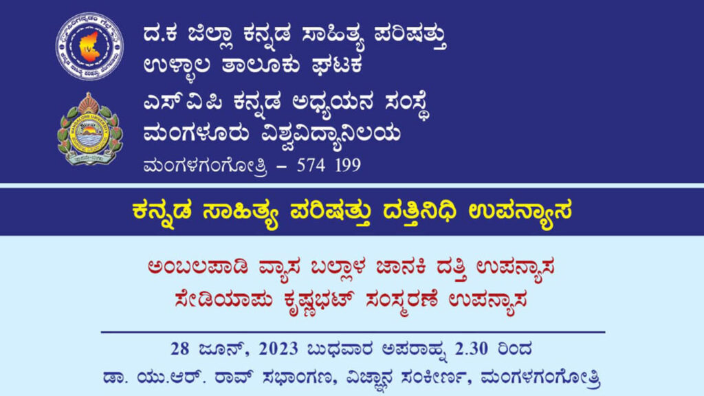 ಮುಡಿಪು: ದ.ಕ ಜಿಲ್ಲಾ ಕನ್ನಡ ಸಾಹಿತ್ಯ ಪರಿಷತ್ತು ಉಳ್ಳಾಲ ತಾಲೂಕು ಘಟಕವು ಮಂಗಳೂರು ವಿಶ್ವವಿದ್ಯಾನಿಲಯದ ಎಸ್ ವಿಪಿ ಕನ್ನಡ ಅಧ್ಯಯನ ಸಂಸ್ಥೆಯ ಸಹಯೋಗದೊಂದಿಗೆ ಕನ್ನಡ ಸಾಹಿತ್ಯ ಪರಿಷತ್ತಿನ ಅಂಬಲಪಾಡಿ ವ್ಯಾಸ ಬಲ್ಲಾಳ ಜಾನಕಿ ದತ್ತಿನಿಧಿ ಉಪನ್ಯಾಸವನ್ನು ಜೂನ್ 28ರಂದು ಅಪರಾಹ್ನ 2.30 ಕ್ಕೆ ಕೊಣಾಜೆ ವಿವಿಯ ವಿಜ್ಞಾನ ಸಂಕೀರ್ಣದಲ್ಲಿರುವ ಯು.ಆರ್ ರಾವ್ ಸಭಾಂಗಣದಲ್ಲಿ ಹಮ್ಮಿಕೊಂಡಿದೆ.