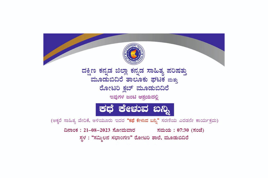 ಮೂಡುಬಿದಿರೆ : ದಕ್ಷಿಣ ಕನ್ನಡ ಜಿಲ್ಲಾ ಕನ್ನಡ ಸಾಹಿತ್ಯ ಪರಿಷತ್ತು ಮೂಡುಬಿದಿರೆ ತಾಲೂಕು ಘಟಕ ಮತ್ತು ರೋಟರಿ ಕ್ಲಬ್ ಮೂಡುಬಿದಿರೆ ಇವುಗಳ ಜಂಟಿ ಆಶ್ರಯದಲ್ಲಿ ಅಕ್ಕರೆ ಸಾಹಿತ್ಯ ವೇದಿಕೆ, ಅಳಿಯೂರು ಇದರ “ಕಥೆ ಕೇಳುವ ಬನ್ನಿ” ಸರಣಿಯ ಎರಡನೇ ಕಾರ್ಯಕ್ರಮ ದಿನಾಂಕ 21-08-2023ರ ಸೋಮವಾರದ ಸಂಜೆ 07:30ಕ್ಕೆ ಮೂಡುಬಿದಿರೆಯ ರೋಟರಿ ಶಾಲೆಯ ‘ಸಮ್ಮಿಲನ ಸಭಾಂಗಣ’ದಲ್ಲಿ ನಡೆಯಲಿದೆ.