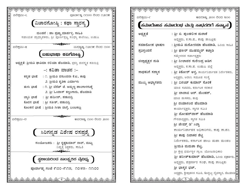 ಕನ್ನಡ ಕಥಾ ಸಾಹಿತ್ಯದ ಚಿಂತನ-ಮಂಥನ ಪರಿಕಲ್ಪನೆಯಲ್ಲಿ ‘ಪರಿಕ್ರಮ’ ಶೀರ್ಷಿಕೆಯಲ್ಲಿ ಜರಗುವ ಸಾಹಿತ್ಯ ಸಮ್ಮೇಳನದಲ್ಲಿ ಕಥೆಗಾರ್ತಿ ಡಾ. ಪ್ರಜ್ಞಾ ಮಾರ್ಪಳ್ಳಿಯವರು ‘ಕಥಾ ಸ್ವಾರಸ್ಯ’ದ ಕುರಿತು ವಿಚಾರ ಮಂಡನೆ ಮಾಡಲಿದ್ದಾರೆ. ಬಹುಭಾಷಾ ಕವಿಗೋಷ್ಠಿಯ ಅಧ್ಯಕ್ಷತೆಯನ್ನು ಪ್ರಶಸ್ತಿ ಪುರಸ್ಕೃತ ಕವಯಿತ್ರಿ ಫಾತಿಮಾ ರಲಿಯಾ ಹೆಜಮಾಡಿ ಇವರು ವಹಿಸಿಕೊಳ್ಳಲಿದ್ದು, ವಸುಂಧರಾ ಕೆ.ಟಿ. ಕಾಪು, ಶೃತಿಕಾ ಎರ್ಮಾಳು (ಕನ್ನಡ ಭಾಷೆ), ಬೆನೆಟ್ ಜೆ. ಅಮೃಣ್ಣ ಕಾಪು ಪಾಂಗಾಳಗುಡ್ಡೆ, ಓಂದಾಸ್ ಕಣ್ಣಂಗಾರ್ ಹೆಜಮಾಡಿ (ತುಳು ಭಾಷೆ), ಹಮೀದ್ ಪಡುಬಿದ್ರಿ (ಬ್ಯಾರಿ ಭಾಷೆ), ಸತೀಶ್ ಪಡುಬಿದ್ರಿ (ಕೊರಗ ಭಾಷೆ), ಗೀತಾ ವಾಗ್ಳೆ ಬಂಟಕಲ್ಲು (ಕೊಂಕಣಿ ಭಾಷೆ)ಯಲ್ಲಿ ಸ್ವರಚಿತ ಕವನಗಳನ್ನು ಪ್ರಸ್ತುತಪಡಿಸಲಿದ್ದಾರೆ. ಕನ್ನಡ ಉಪನ್ಯಾಸಕಿ ಯಶೋದ ಎಲ್ಲೂರು ಗೋಷ್ಠಿಯ ನಿರ್ವಹಣೆ ಮಾಡಲಿದ್ದಾರೆ. ನಿವೃತ್ತ ಶಿಕ್ಷಕ, ಸಾಹಿತಿ ಕೃಷ್ಣಕುಮಾರ್ ರಾವ್ ಮಟ್ಟು ಸಂಯೋಜನೆಯಲ್ಲಿ ‘ಸಿರಿಗನ್ನಡ ವಿಶೇಷ ರಸಪ್ರಶ್ನೆ’ ಜರಗಲಿದ್ದು, ಸ್ಥಳೀಯ ಪ್ರತಿಭೆಗಳಿಂದ ಸಾಂಸ್ಕೃತಿಕ ವೈವಿಧ್ಯ ನೆರವೇರಲಿದೆ.