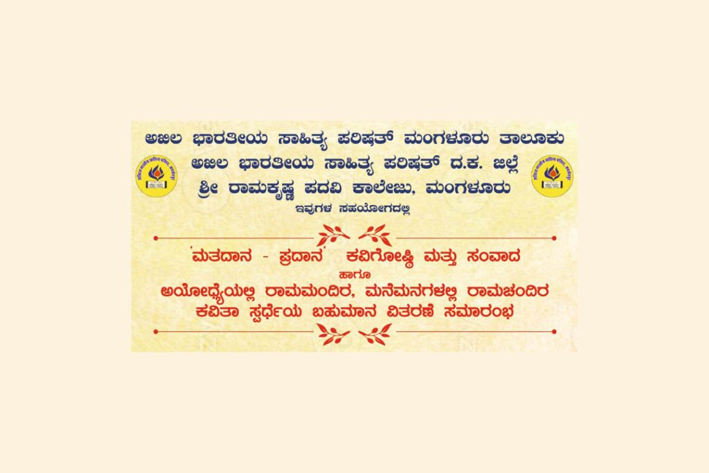 ಮಂಗಳೂರು : ಅಖಿಲ ಭಾರತೀಯ ಸಾಹಿತ್ಯ ಪರಿಷತ್ ಮಂಗಳೂರು ತಾಲೂಕು, ಅಖಿಲ ಭಾರತೀಯ ಸಾಹಿತ್ಯ ಪರಿಷತ್ ದ.ಕ. ಜಿಲ್ಲೆ ಮತ್ತು ಶ್ರೀ ರಾಮಕೃಷ್ಣ ಪದವಿ ಕಾಲೇಜು ಮಂಗಳೂರು ಇವುಗಳ ಸಹಯೋಗದಲ್ಲಿ ‘ಮತದಾನ – ಪ್ರದಾನ ಕವಿಗೋಷ್ಠಿ ಮತ್ತು ಸಂವಾದ’ ಕಾರ್ಯಕ್ರಮವನ್ನು ದಿನಾಂಕ 20-04-2024ರಂದು ಬೆಳಗ್ಗೆ 10-00 ಗಂಟೆಗೆ ಮಂಗಳೂರಿನ ಬಂಟ್ಸ್ ಹಾಸ್ಟಲ್ ಇಲ್ಲಿರುವ ಶ್ರೀ ರಾಮಕೃಷ್ಣ ಪದವಿ ಕಾಲೇಜಿನ ಸೆಮಿನಾರ್ ಹಾಲ್ ನಲ್ಲಿ ಹಮ್ಮಿಕೊಳ್ಳಲಾಗಿದೆ.