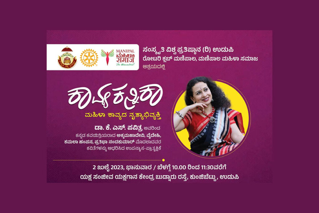 ಉಡುಪಿ : ಸಂಸ್ಕೃತಿ ವಿಶ್ವ ಪ್ರತಿಷ್ಠಾನ, ರೋಟರಿ ಕ್ಲಬ್ ಮಣಿಪಾಲ ಹಾಗೂ ಮಣಿಪಾಲ ಮಹಿಳಾ ಸಮಾಜ ಆಶ್ರಯದಲ್ಲಿ ಬೆಂಗಳೂರಿನ ಕನ್ನಡ ಮತ್ತು ಸಂಸ್ಕೃತಿ ಇಲಾಖೆಯ ಸಹಕಾರದೊಂದಿಗೆ ‘ಕಾವ್ಯಕನ್ನಿಕಾ’ ಮಹಿಳಾ ಕಾವ್ಯದ ನೃತ್ಯಾಭಿವ್ಯಕ್ತಿ ಕಾರ್ಯಕ್ರಮವನ್ನು ದಿನಾಂಕ 02-06-2023ರ ಭಾನುವಾರ ಬೆಳಗ್ಗೆ 10ರಿಂದ 11.30ರವರೆಗೆ ಉಡುಪಿಯ ಕುಂಜಿಬೆಟ್ಟಿನ ಬುಡ್ನಾರು ರಸ್ತೆಯಲ್ಲಿರುವ ಯಕ್ಷ ಸಂಜೀವ ಯಕ್ಷಗಾನ ಕೇಂದ್ರದಲ್ಲಿ ಹಮ್ಮಿಕೊಳ್ಳಲಾಗಿದೆ. ಡಾ. ಕೆ.ಎಸ್. ಪವಿತ್ರ ಅವರಿಂದ ಕನ್ನಡ ಕವಯತ್ರಿಯರಾದ ಅಕ್ಕಮಹಾದೇವಿ, ವೈದೇಹಿ, ಕಮಲಾ ಹಂಪನ ಮತ್ತು ಪ್ರತಿಭಾ ನಂದಕುಮಾರ್ ಮೊದಲಾದವರ ಕವಿತೆಗಳನ್ನು ಆಧರಿಸಿದ ಉಪನ್ಯಾಸ ಪ್ರಾತ್ಯಕ್ಷಿಕೆ ಇದಾಗಿದೆ.