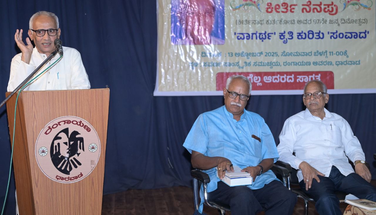 ಧಾರವಾಡ : ಮನೋಹರ ಗ್ರಂಥಮಾಲ ಹಾಗೂ ಕುರ್ತಕೋಟಿ ಮೆಮೋರಿಯಲ್ ಟ್ರಸ್ಟ್ ಇವರ ಸಂಯುಕ್ತ ಆಶ್ರಯದಲ್ಲಿ ಕೀರ್ತಿನಾಥ ಕುರ್ತಕೋಟಿ ಇವರ 97ನೇ ಜನ್ಮದಿನದ ಪ್ರಯುಕ್ತ ಆಯೋಜಿಸಿದ ‘ಕೀರ್ತಿ ನೆನಪು’ ಹಾಗೂ ‘ವಾಗರ್ಥ’ ಕೃತಿ ಕುರಿತು ಸಂವಾದ ಕಾರ್ಯಕ್ರಮವು ದಿನಾಂಕ 13 ಅಕ್ಟೋಬರ್ 2025ರ ಸೋಮವಾರದಂದು ಧಾರವಾಡದ ರಂಗಾಯಣ ಆವರಣದಲ್ಲಿರುವ ಸುವರ್ಣ ಸಾಂಸ್ಕೃತಿಕ ಸಮುಚ್ಚಯದಲ್ಲಿ ನಡೆಯಿತು.