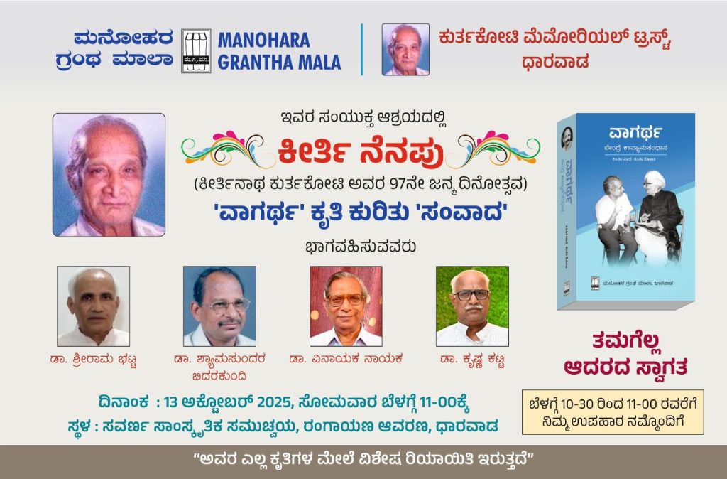 ಧಾರವಾಡ : ‘ಕನ್ನಡದ ಕೀರ್ತಿ’ ಕೀರ್ತಿನಾಥ ಕುರ್ತಕೋಟಿಯವರ 97ನೆ ಜನ್ಮದಿನವನ್ನು ಮನೋಹರ ಗ್ರಂಥಮಾಲೆ ಹಾಗೂ ಕುರ್ತಕೋಟಿ ಮೆಮೋರಿಯಲ್ ಟ್ರಸ್ಟ್ ಸಂಯುಕ್ತವಾಗಿ ‘ಕೀರ್ತಿ ನೆನಪು’ ಕಾರ್ಯಕ್ರಮವನ್ನು ದಿನಾಂಕ 13 ಅಕ್ಟೋಬರ್ 2025 ಸೋಮವಾರದಂದು ಬೆಳಗ್ಗೆ 11-00 ಗಂಟೆಗೆ ಧಾರವಾಡದ ರಂಗಾಯಣ ಆವರಣದಲ್ಲಿರುವ ಸವರ್ಣ ಸಾಂಸ್ಕೃತಿಕ ಸಮುಚ್ಚಯದಲ್ಲಿ ಹಮ್ಮಿಕೊಂಡಿವೆ.